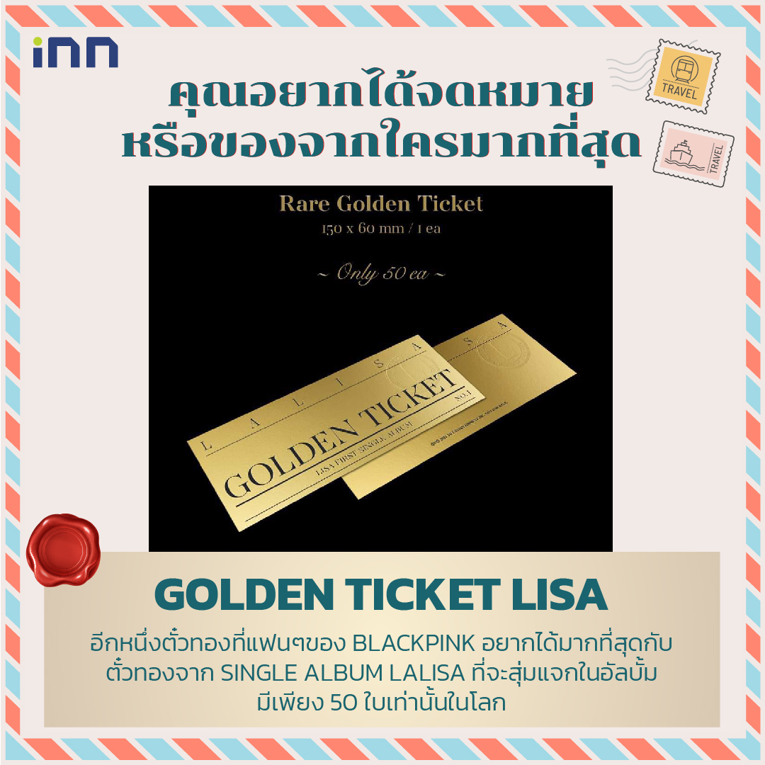 อีกหนึ่งตั๋วทองที่แฟนๆ ของ BLACKPINK อยากได้มากที่สุดกับ ตั๋วทองจาก SINGLE ALBUM LALISA ที่จะสุ่มแจกในอัลบั้มมีเพียง 50 ใบเท่านั้นในโลก ผู้ที่ได้จะได้สิทธิหรือของสุดพิเศษ (มีแฟนคลับบอกมาว่า น่าจะเป็นเสื้อฮู้ดมัดย้อมที่ลิซ่าย้อมเองกับมือ ยังไงก็รอดูอย่างเป็นทางการอีกครั้ง)