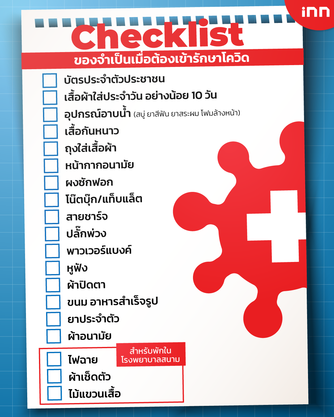 จากสถานการณ์โควิด-19 ในปัจจุบันท่ามกลางผู้ป่วยที่มีเพิ่มขึ้นเป็นจำนวนมาก เพื่อเป็นการป้องกันและเตรียมตัวสำหรับใครที่จำเป็นต้องกักตัวในห้องพยาบาล โรงพยาบาลสนาม และ Hospitel ตามแต่ละจังหวัด iNN ขอเป็นส่วนช่วยในการนำเช็กลิสต์สิ่งของที่ควรพกติดตัวเมื่อวันที่จำเป็น