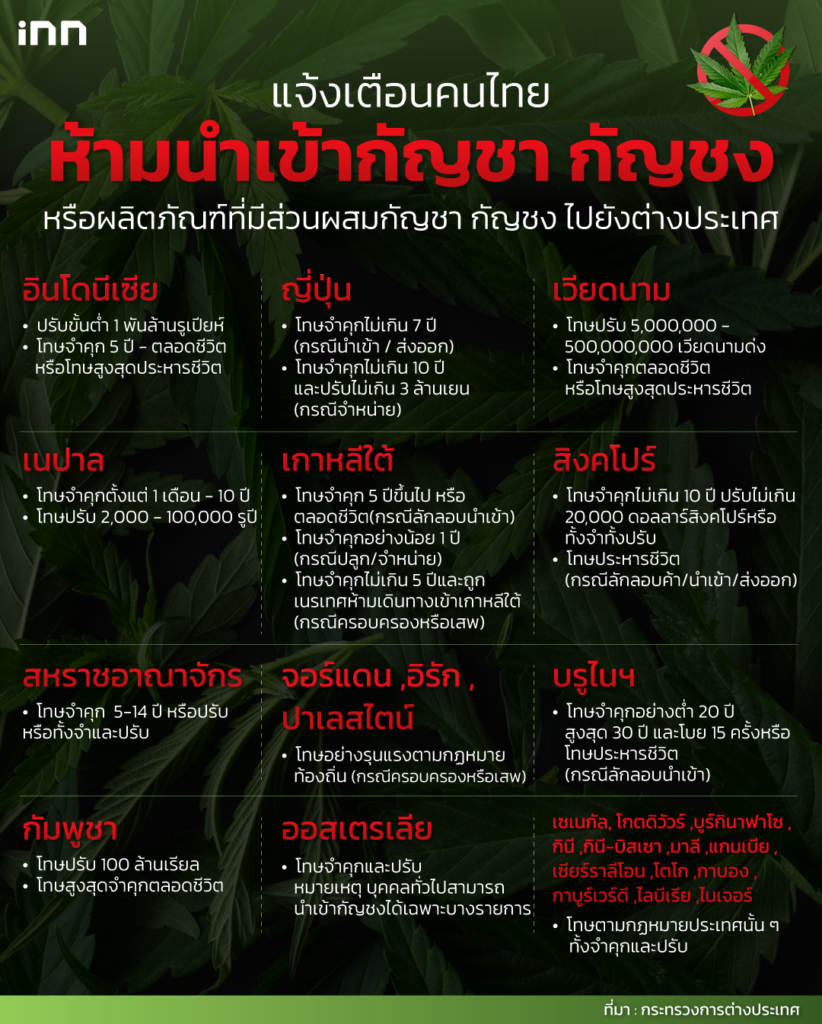 กระทรวงการต่างประเทศ ได้โพสต์เตือนคนไทย ห้าม นำเข้า กัญชา กัญชง หรือผลิตภัณฑ์ที่มีส่วนประกอบของพืชชนิดดังกล่าวไปยังต่างประเทศ เพราะในบางประเทศยังเป็นสิ่งต้องห้ามและมีโทษสูงถึงประหารชีวิต
