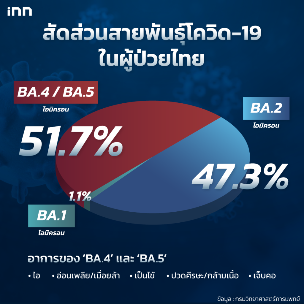 สำหรับประเทศไทยเอง นพ.ศุภกิจ ศิริลักษณ์ อธิบดีกรมวิทยาศาสตร์การแพทย์ได้เปิดเผยกับประชาชนว่า ณ ตอนนี้ผู้ติดเชื้อในไทย 100% ป่วยด้วยสายพันธ์ุโอมิครอน รวมถึงเมื่อเจาะกลุ่มตัวอย่างผู้ป่วยโควิด พบว่ามีผู้ติดเชื้อโอมิครอนสายพันธ์ุย่อย BA.4 / BA.5 สูงถึง 489 ราย คิดเป็น 51.7% จากทั้งหมด จึงเป็นเหตุผลชัดเจนแล้วว่าเชื้อไวรัสสายพันธุ์นี้ได้ข้ามน้ำมาไทยและแพร่แบบเต็มเม็ดเต็มหน่วยเรียบร้อย