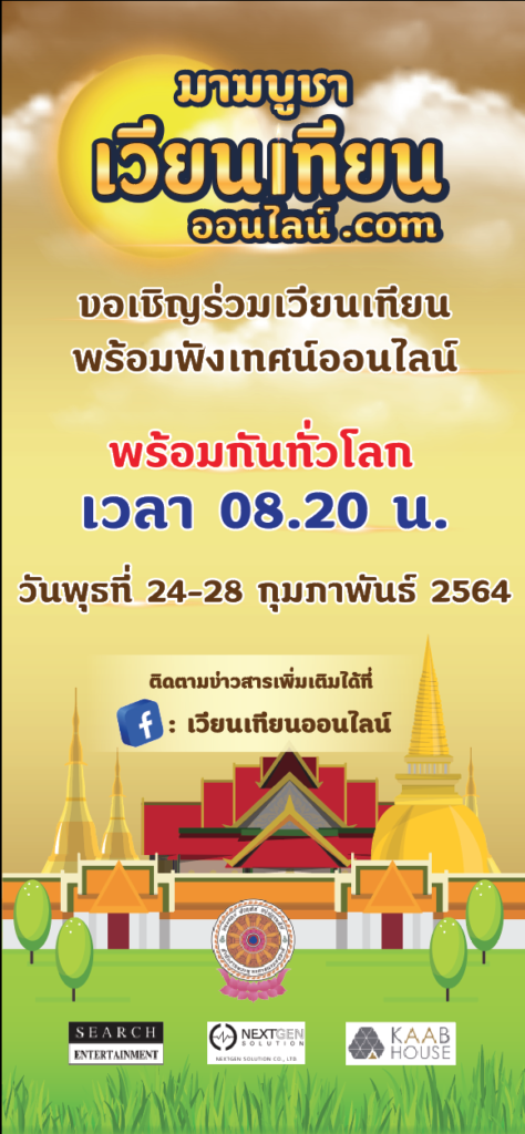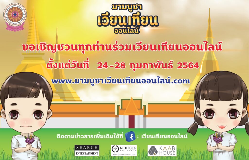 สำนักงานพระพุทธศาสนาแห่งชาติ  ร่วมกับ NextGen Solution, KAAB House (ค๊าปเฮาท์) และกลุ่มบริษัท เซิร์ชฯ โดยมีพระมหา ดร.ณัฐพงษ์ นาคถ้ำ ที่ปรึกษาฝ่ายสงฆ์ ขอเชิญชวนพุทธศาสนิกชนที่อยู่ต่างประเทศ และในประเทศไทยร่วมกิจกรรมในโครงการสัปดาห์พุทธศาสนา ด้วยการเวียนเทียนออนไลน์เนื่องในวันมาฆบูชา “เวียนเทียนออนไลน์ ห่างไกลโควิด รักษาชีวิต รักษาธรรมในวันมาฆบูชา” เพื่อเป็นประโยชน์ในการทำนุบำรุงพระพุทธศาสนา และเป็นประโยชน์ต่อสังคม ในการเข้าถึงศาสนา ซึ่งจะเป็นอีกทางเลือกหนึ่งในช่วงสถานการณ์การระบาดของโรคโควิด-19 ที่เราจำเป็นต้องเว้นระยะห่างทางสังคม (Social Distancing) โดยประชาชนสามารถร่วมเวียนเทียนได้แม้จะอยู่ที่บ้าน หรือเข้า State quarantine สำหรับคนไทยในต่างแดนที่ไม่สามารถเดินทางไปทำกิจกรรมที่วัดได้ ก็สามารถมาร่วมเวียนเทียนออนไลน์กับเราได้อีกหนึ่งช่องทาง