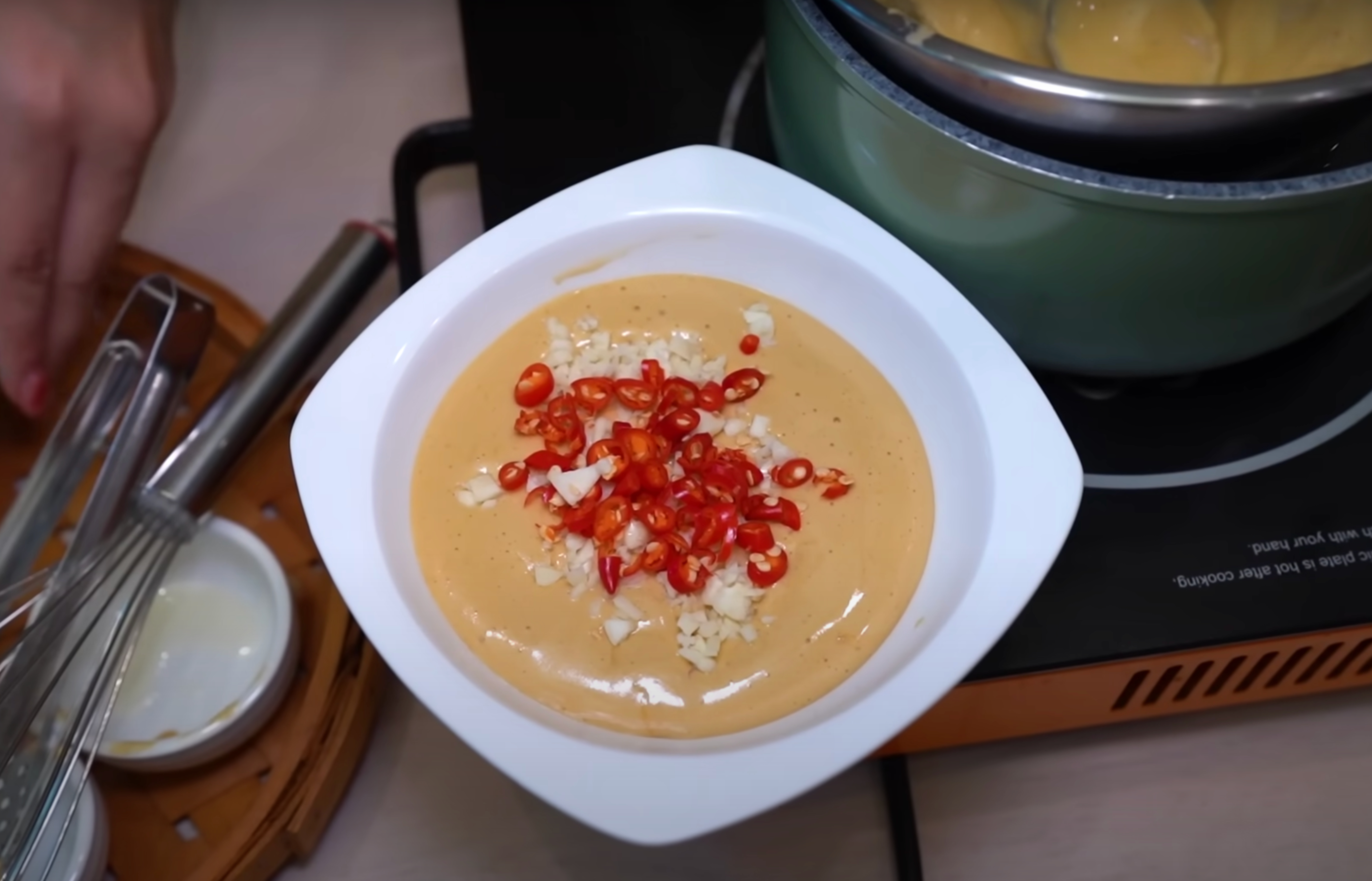 จากนั้น ตั้งน้ำให้เดือด แล้วนำส่วนผสมที่เราเตรียมไว้ ตีทุกอย่างบนน้ำร้อนให้เข้ากัน (จะใช้เป็นที่ตีไฟฟ้าหรือตะกร้อมือก็ได้นะ) แนะนำให้ตีจนขึ้นฟูเลย น้ำจิ้มของเราจะได้เนียนๆ ละมุนลิ้น