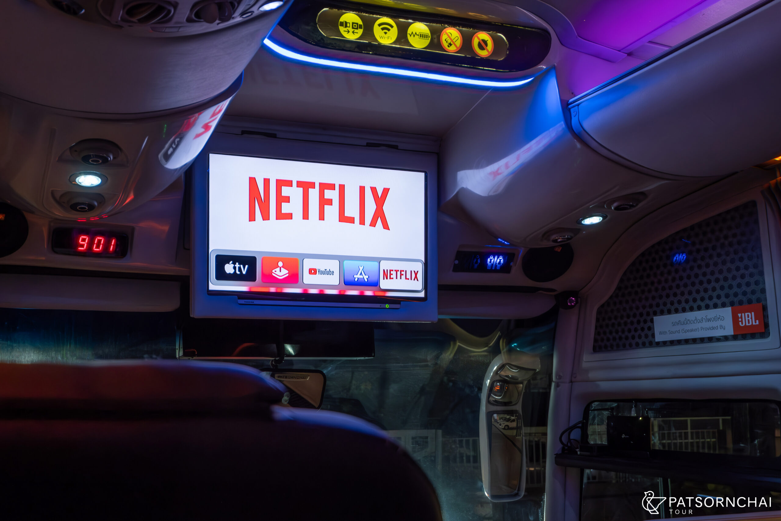 สองแถวติดแอร์ แบบพรีเมี่ยม (Only at Patsornchai Tour) สองแถวติดแอร์ที่ออกแบบให้หรูหรา ภายในห้องโดยสารมีฟังก์ชันจัดเต็มด้วย Apple TV 4K,ระบบเครื่องคุณภาพ, Panoramic Front Window และหลังคากระจก Panoramic Glass Roof