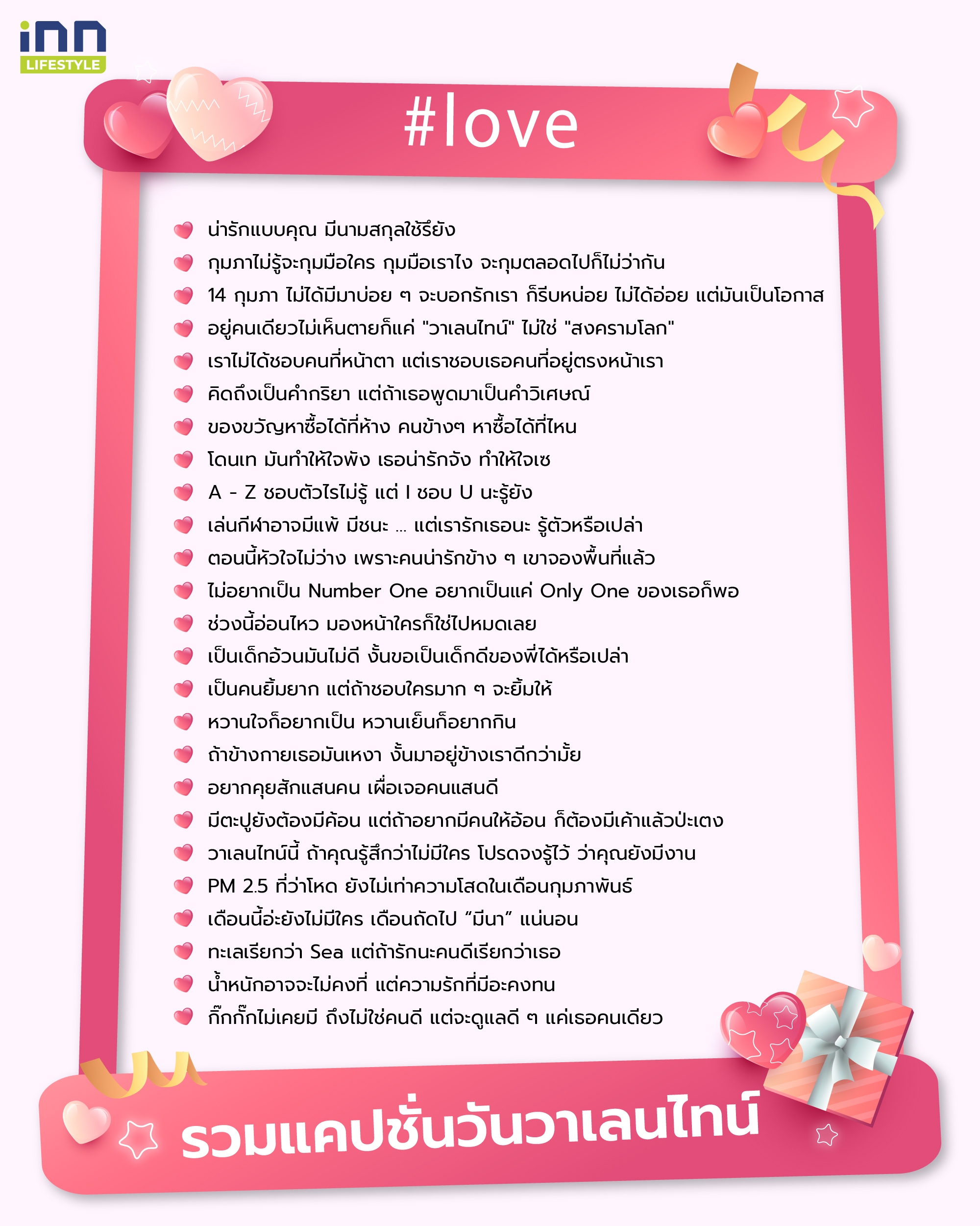 สวัสดีเดือนแห่งความรัก วันวาเลนไทน์ทั้งที ทางสำนักข่าว ไอ.เอ็น.เอ็น. ได้รวมคำคมแคปชั่นสำหรับวันวาเลนไทน์มาให้ทุกคนแล้วที่นี่ รับรองว่าเอาไปโพสต์เรียกยอดไลค์ได้เพียบ เผื่อจะได้เจอคนของใจ หรือถ้าใครที่มีคู่แล้วก็นำไปโพสต์หวานๆให้แฟนเพิ่มดีกรีความหวานได้เพิ่มกรุบๆ มีทั้งภาษาไทย ภาษาอังกฤษ เซฟเก็บไว้ใช้ทั้งปีได้เลยล่ะ พูดแล้วไม่รอช้าไปส่องกันต่อเล้ยย!