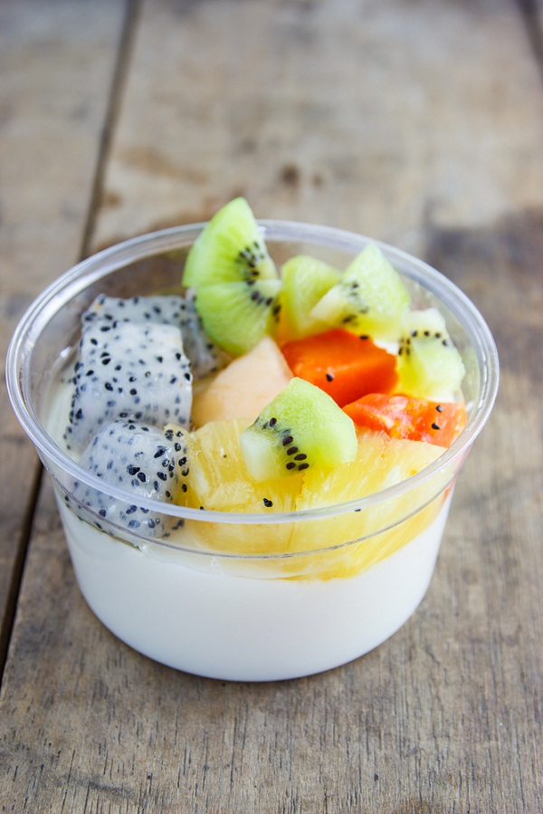 - ผลไม้ตามชอบ หั่นเต๋าเล็ก ( สับปะรด องุ่น มะละกอ และแก้วมังกร)