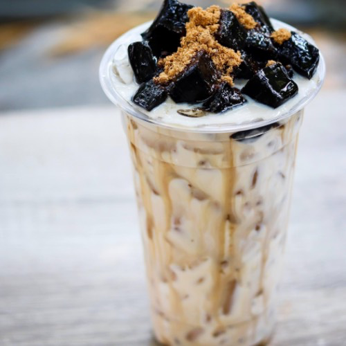 - จากนั้นเทนมสดรสจืด และใส่เฉาก๊วยหั่นเต๋า โรยน้ำตาลอ้อย ถือเป็นอันเสร็จสิ้น พร้อมเสิร์ฟค่ะ