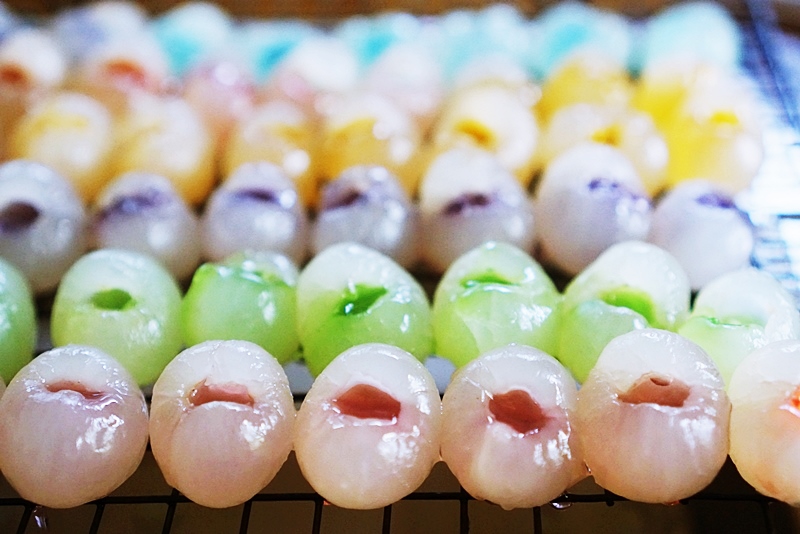 - เตรียมนำไปหยอดลงในลำไย โดยนำน้ำวุ้นที่ผสมสีเสร็จแล้วหยอดลงในลำไย และนำไปพักไว้ให้เซตตัว จากนั้นนำไปแช่เย็นเป็นเวลา 30 นาที แล้วนำมาจัดเสิร์ฟ