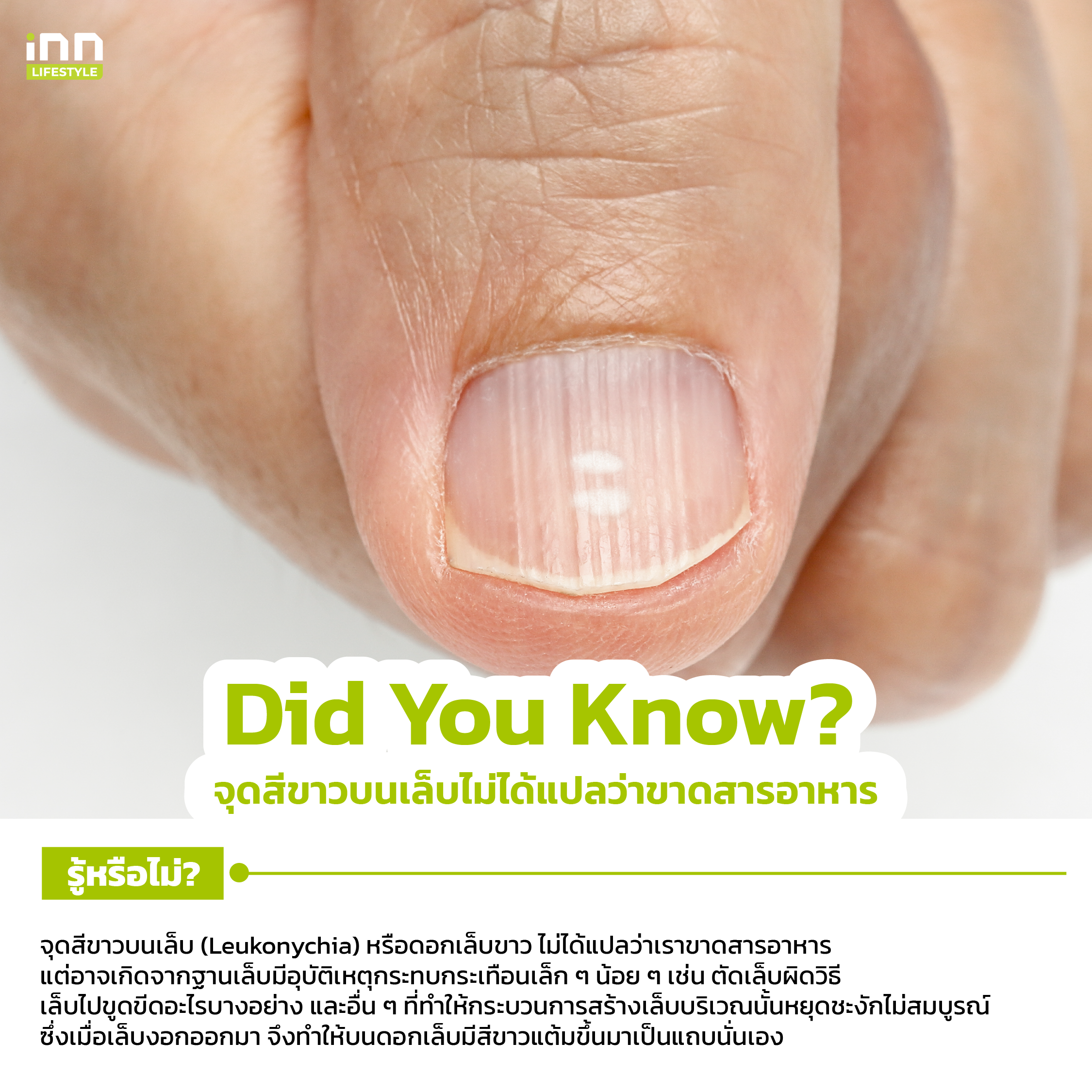 รู้หรือไม่! จุดสีขาวบนเล็บ (Leukonychia) หรือดอกเล็บขาว ไม่ได้แปลว่าเราขาดสารอาหาร แต่อาจเกิดจากฐานเล็บมีอุบัติเหตุกระทบกระเทือนเล็ก ๆ น้อย ๆ เช่น ตัดเล็บผิดวิธี เล็บไปขูดขีดอะไรบางอย่าง และอื่น ๆ ที่ทำให้กระบวนการสร้างเล็บบริเวณนั้นหยุดชะงักไม่สมบูรณ์ ซึ่งเมื่อเล็บงอกออกมา จึงทำให้บนดอกเล็บมีสีขาวแต้มขึ้นมาเป็นแถบนั่นเอง