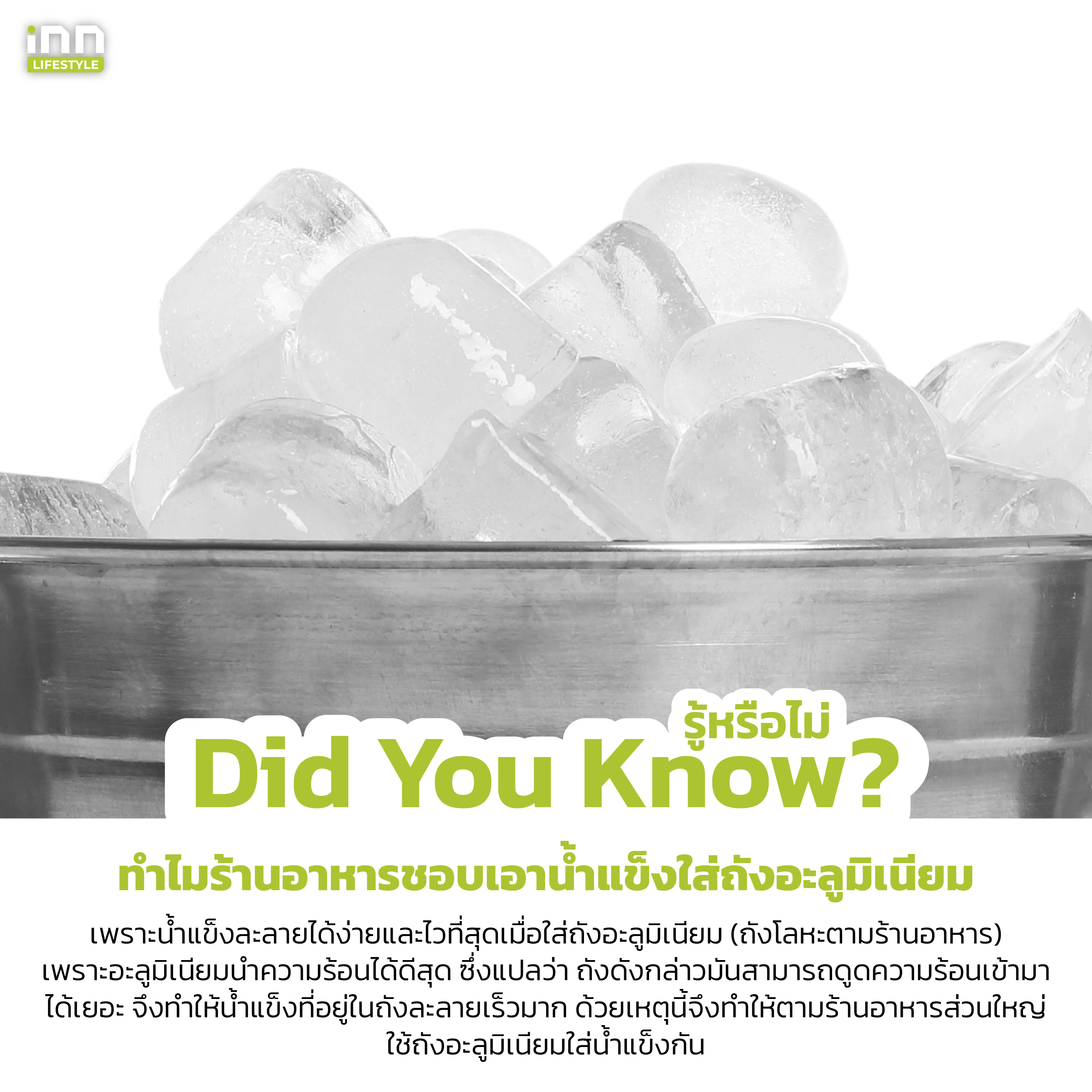 รู้หรือไม่ ทำไมร้านอาหารชอบเอาน้ำแข็งใส่ถังอะลูมิเนียม เพราะน้ำแข็งละลายได้ง่ายและไวที่สุดเมื่อใส่ถังอะลูมิเนียม (ถังโลหะตามร้านอาหาร) เพราะอะลูมิเนียมนำความร้อนได้ดีสุด ซึ่งแปลว่าถังดังกล่าวมันสามารถดูดความร้อนเข้ามาได้เยอะ จึงทำให้น้ำแข็งที่อยู่ในถังละลายเร็วมาก ด้วยเหตุนี้จึงทำให้ตามร้านอาหารส่วนใหญ่ ใช้ถังอะลูมิเนียมใส่น้ำแข็งกัน