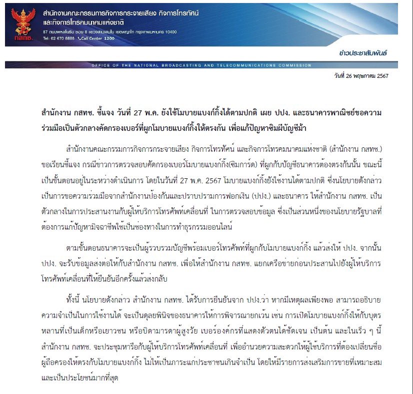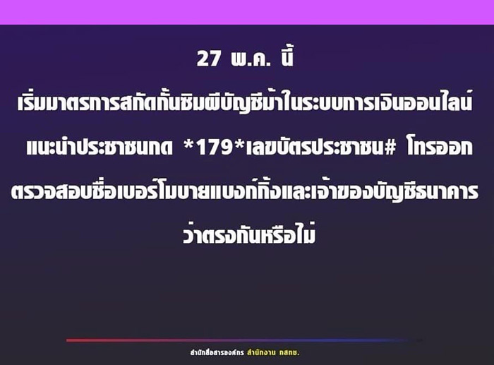 จากกรณีที่สำนักงานคณะกรรมการกิจการกระจายเสียง กิจการโทรทัศน์ และกิจการโทรคมนาคมแห่งชาติ หรือ สำนักงาน กสทช. ออกมาตรการเข้มแนะนำให้ประชาชนตรวจสอบเบอร์ mobile banking ที่ผูกกับบัญชีธนาคารต้องเป็นบุคคลเดียวกัน เพื่อป้องกันซิมผี บัญชีม้า ซึ่งเป็นส่วนหนึ่งของนโยบายรัฐบาลที่ต้องการแก้ปัญหามิจฉาชีพใช้เป็นช่องทางในการทำธุรกรรมออนไลน์ โดยเริ่มสแกน 106 ล้านบัญชี ดีเดย์ 27 พฤษภาคม 2567 หากพบชื่อไม่ตรงกับ mobile banking จะต้องลงทะเบียนใหม่