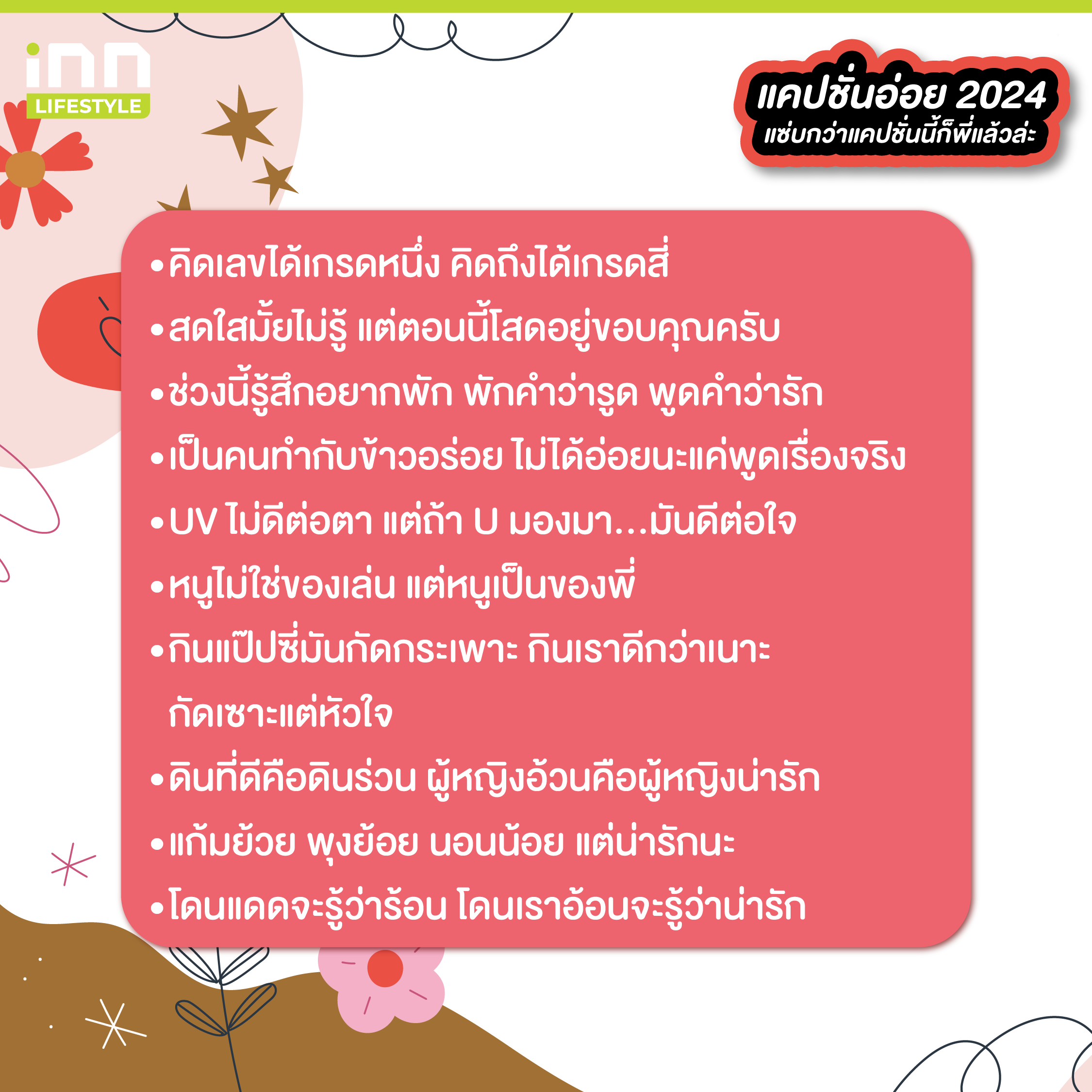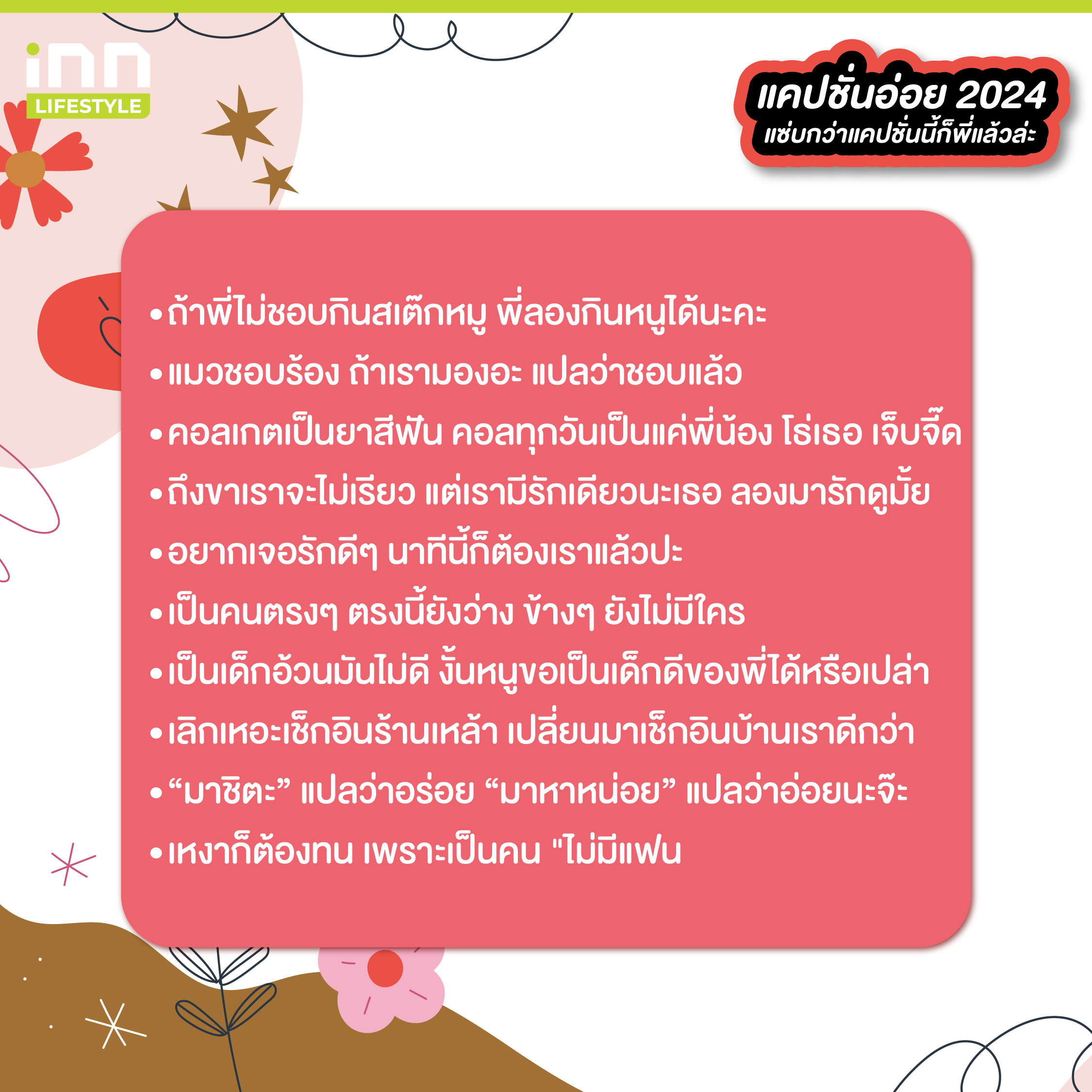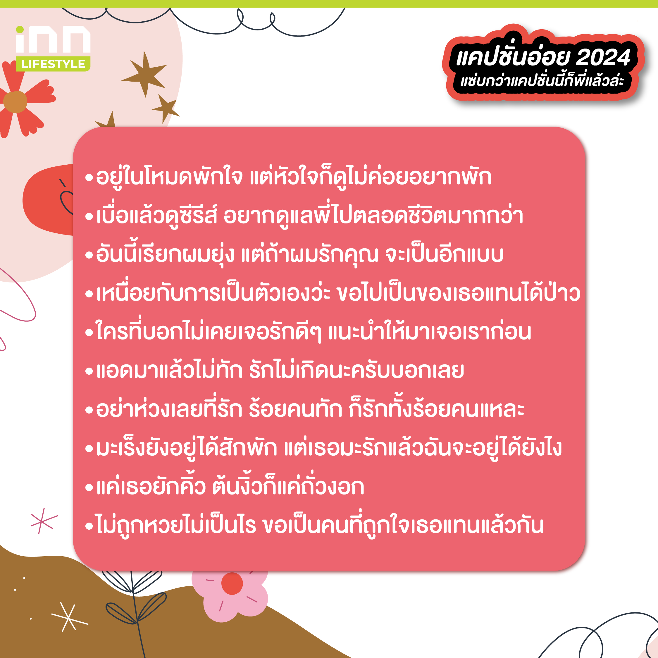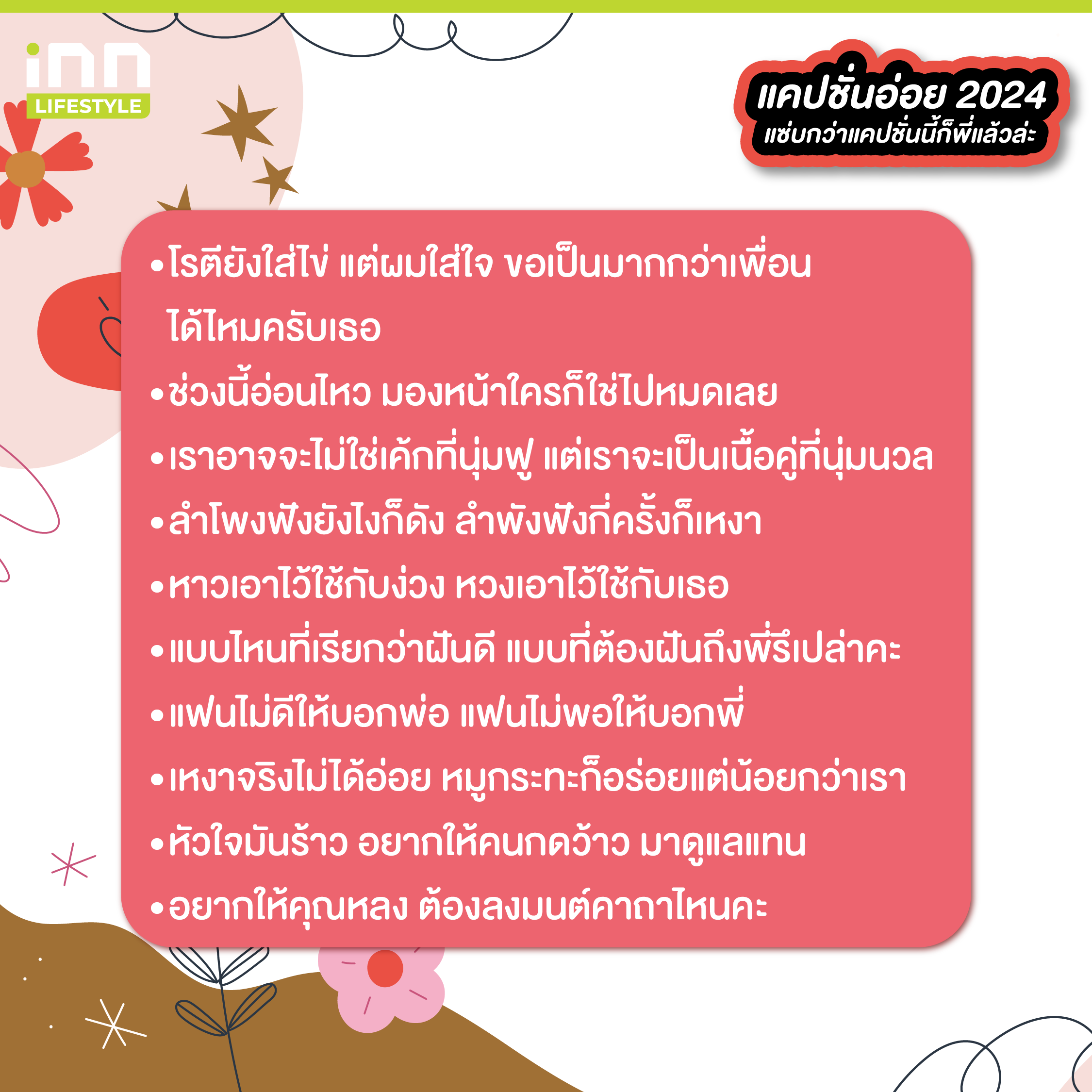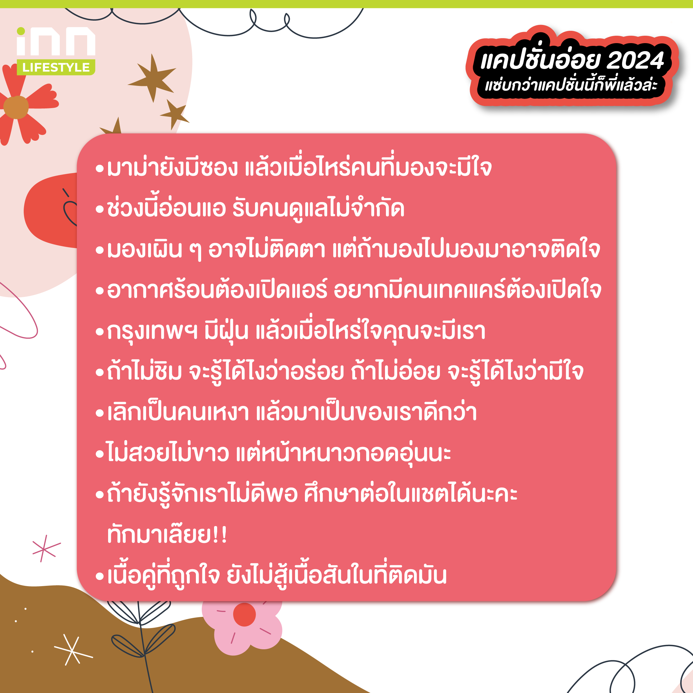และทั้งหมดนี้ก็คือแคปชั่นอ่อย 2024 เอาไว้โพสต์เรียกยอดไลก์ ที่เราเอามาฝากทุกคนกัน พอจะมีประโยคไหนที่โดนใจจนนำมาใส่เป็นแคปชั่นตอนอัพรูปกันบ้างไหมเอ่ยยย ถ้าชอบบทความสนุก ๆ แบบนี้ สามารถติดตามได้ที่ iNN Lifestyle
