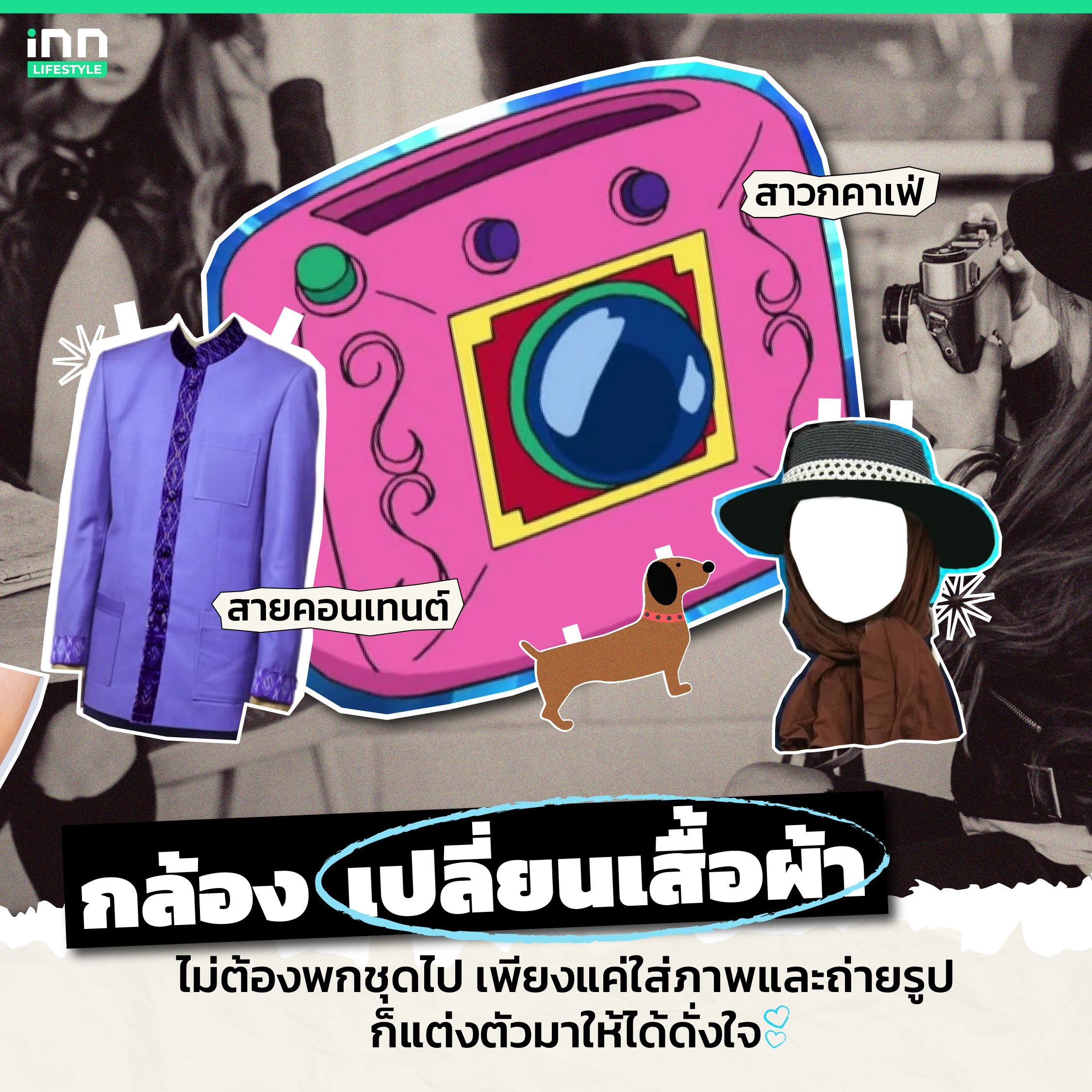 ใส่แบบเสื้อผ้าลงไปบนตัวกล้องก่อนถ่ายรูปเพื่อให้สามารถเล็งไปยังฝ่ายที่จะเปลี่ยนชุดได้  ยุคนี้สายคอนเทนต์ต้องชอบมากๆแน่ เพราะไม่ต้องพกไปหลาย ก็ถ่ายแล้วเปลี่ยนได้เลย มันจึ้งมาก