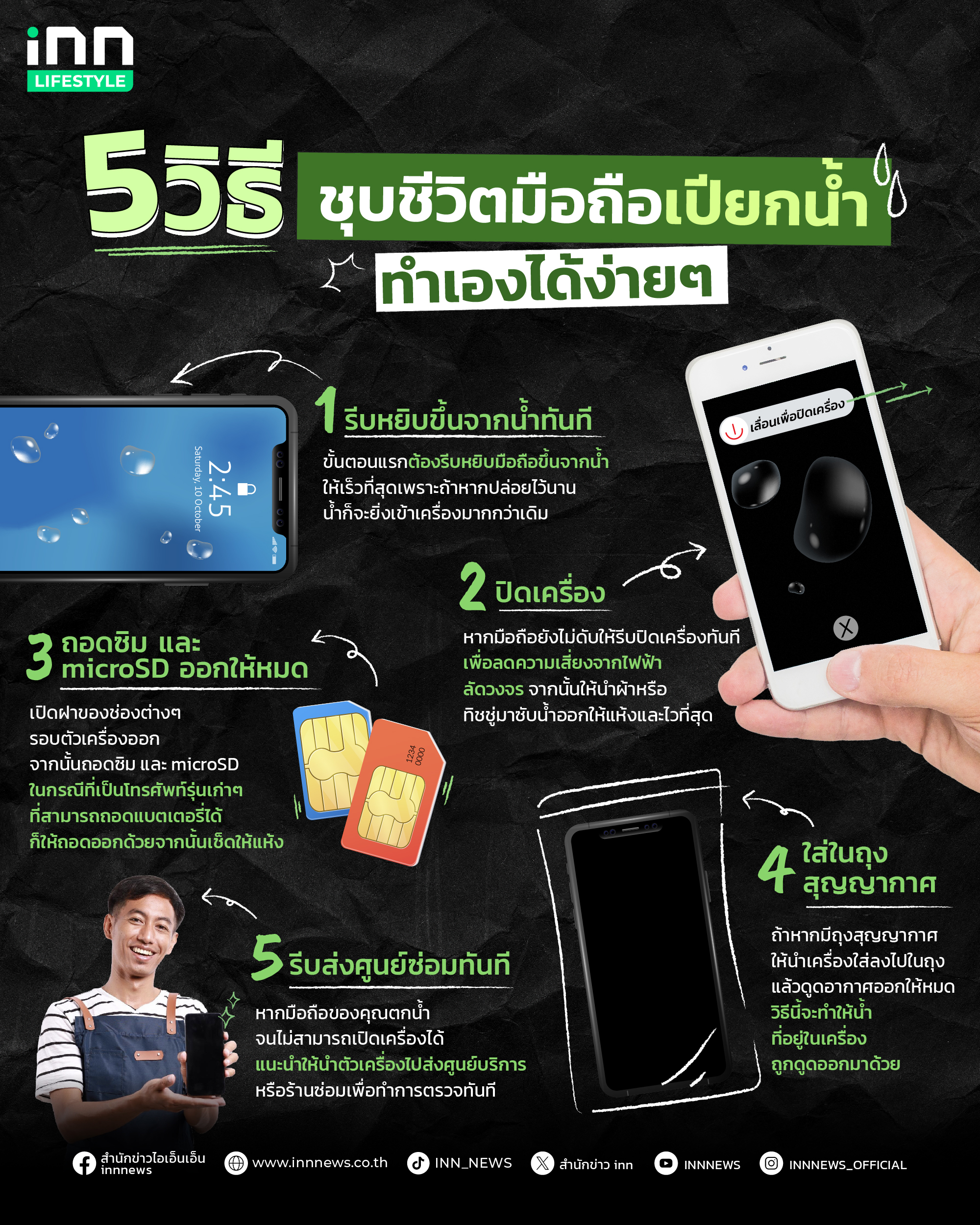 อย่างไรก็ตามเมื่อมือถือเปียกน้ำสิ่งที่ควรทำเป็นอันดับแรกคือตั้งสติ รีบปิดเครื่อง ถอดซิมอุปกรณ์เสริม และซับน้ำให้แห้ง เพื่อช่วยลดความเสียหายและเพิ่มโอกาสที่มือถือของคุณจะกลับมาใช้งานได้เหมือนเดิม
