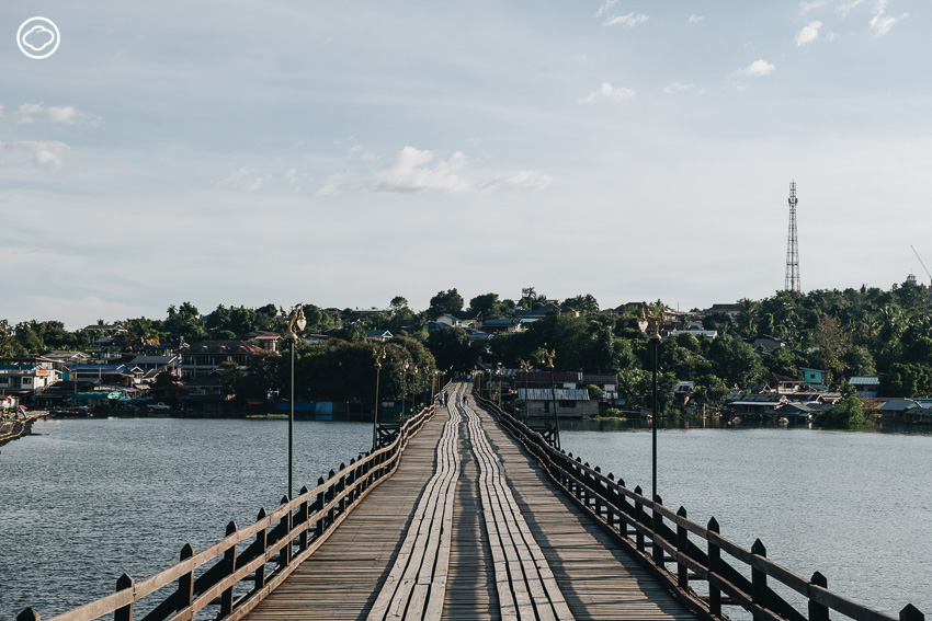 ไฮไลท์สำคัญที่ทุกคนต้องไปเยือนคือ “สะพานมอญ” หรือสะพานอุตตมานุสรณ์ สะพานไม้ยาว 850 เมตรที่ทอดยาวข้ามแม่น้ำซองกาเลีย ที่เชื่อมโยงความสัมพันธ์ระหว่างไทยและมอญ หากเราเดินไปตามสะพานจะได้พบกับการแต่งกายที่เป็นเอกลักษณ์ของชาวมอญ และเสน่ห์เฉพาะตัวของที่นี่คือการมีกลุ่มสาวมอญที่เดินเรียงรายด้วยท่าทางอันสง่างาม พร้อมกับ “เทินของ” ไว้บนศีรษะ มีทั้งขนาดเล็กและใหญ่แตกต่างกันออกไปตามความชำนาญ