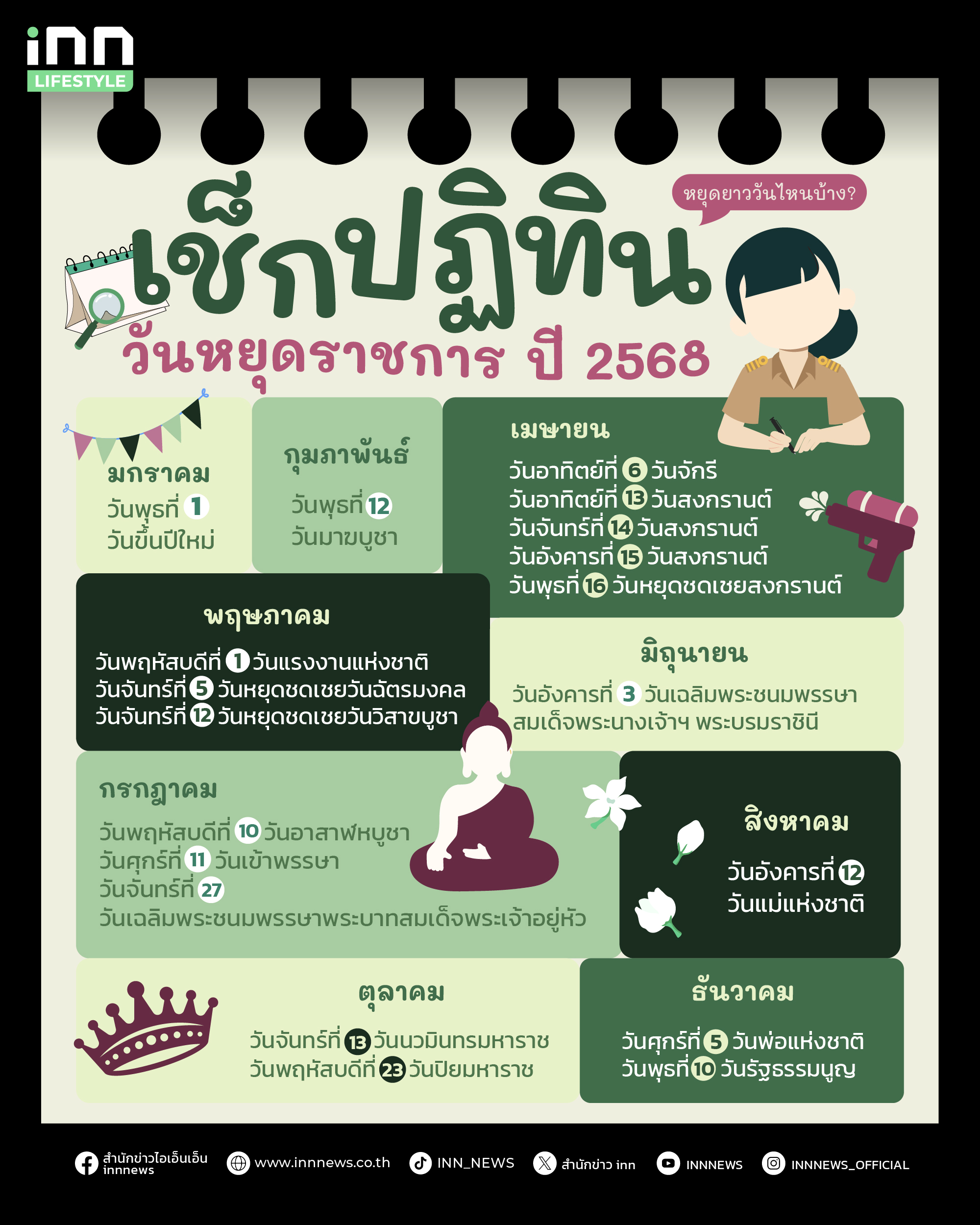 ทั้งนี้ วันหยุดทั้งหมดนี้เป็นเพียงการกำหนดจากสำนักงานราชการ ส่วนชาวออฟฟิศคนไหนที่เล็งหาวันหยุดก็ต้องเช็กผ่านประกาศของหน่วยงานตัวเองด้วยเหมือนกันนะ และสำหรับใครที่วางแผนท่องเที่ยวหยุดยาวพักสมองปีนี้แล้วอยากวางแผนสุขภาพตัวเองด้วย สามารถเลือกทิปส์ความรู้ดีๆต่อได้ที่ iNN Lifestyle