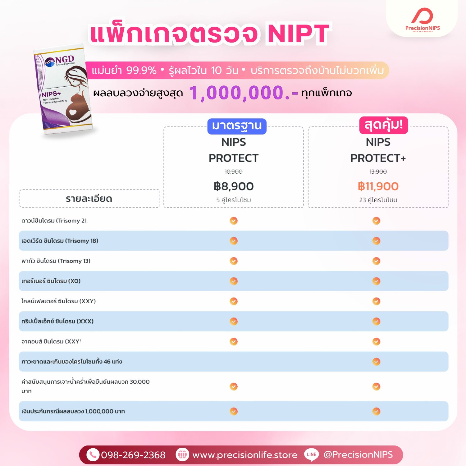 อย่าปล่อยให้ความกังวลเรื่องสุขภาพลูกน้อยในครรภ์เป็นภาระใจอีกต่อไป PrecisionLife พร้อมดูแลคุณแม่และลูกน้อยด้วยการตรวจ NIFTY, NIPT ที่แม่นยำและปลอดภัย สามารถจองคิวตรวจได้แล้ววันนี้ผ่าน Line ID: @PrecisionNIPS หรือโทร 098-269-2368 รับโปรโมชันพิเศษ พร้อมบริการตรวจถึงบ้านทั่วประเทศไทย ในราคาเริ่มต้นเพียง 8,900 บาท