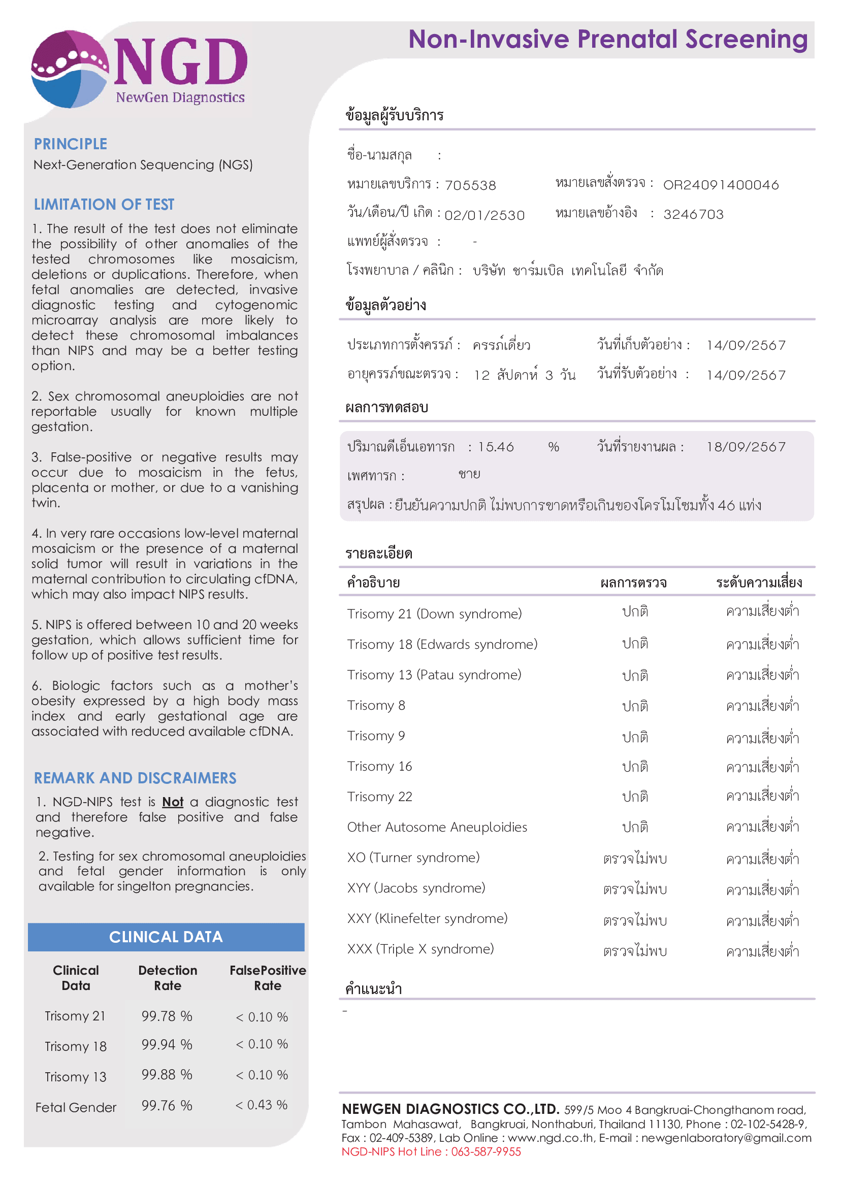 รูปภาพตัวอย่างผลตรวจ NIPT ครรภ์เดี่ยว