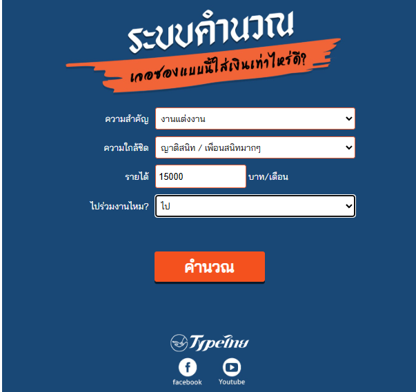 ทั้งนี้หากเราเข้าไปในเว็บไซต์จะมี 3 สิ่งให้เราเลือกคือระดับความสัมพันธ์ของเรากับเจ้าภาพ รายได้ต่อเดือน และเราไปร่วมงานแต่งครั้งนั้นหรือไม่ สูตรนี้เป็นเพียงคำแนะนำเพื่อช่วยในการตัดสินใจ จะใส่มากใส่น้อยขึ้นอยู่กับความพร้อมและความสนิทสนมของแต่ละคนนะคะ