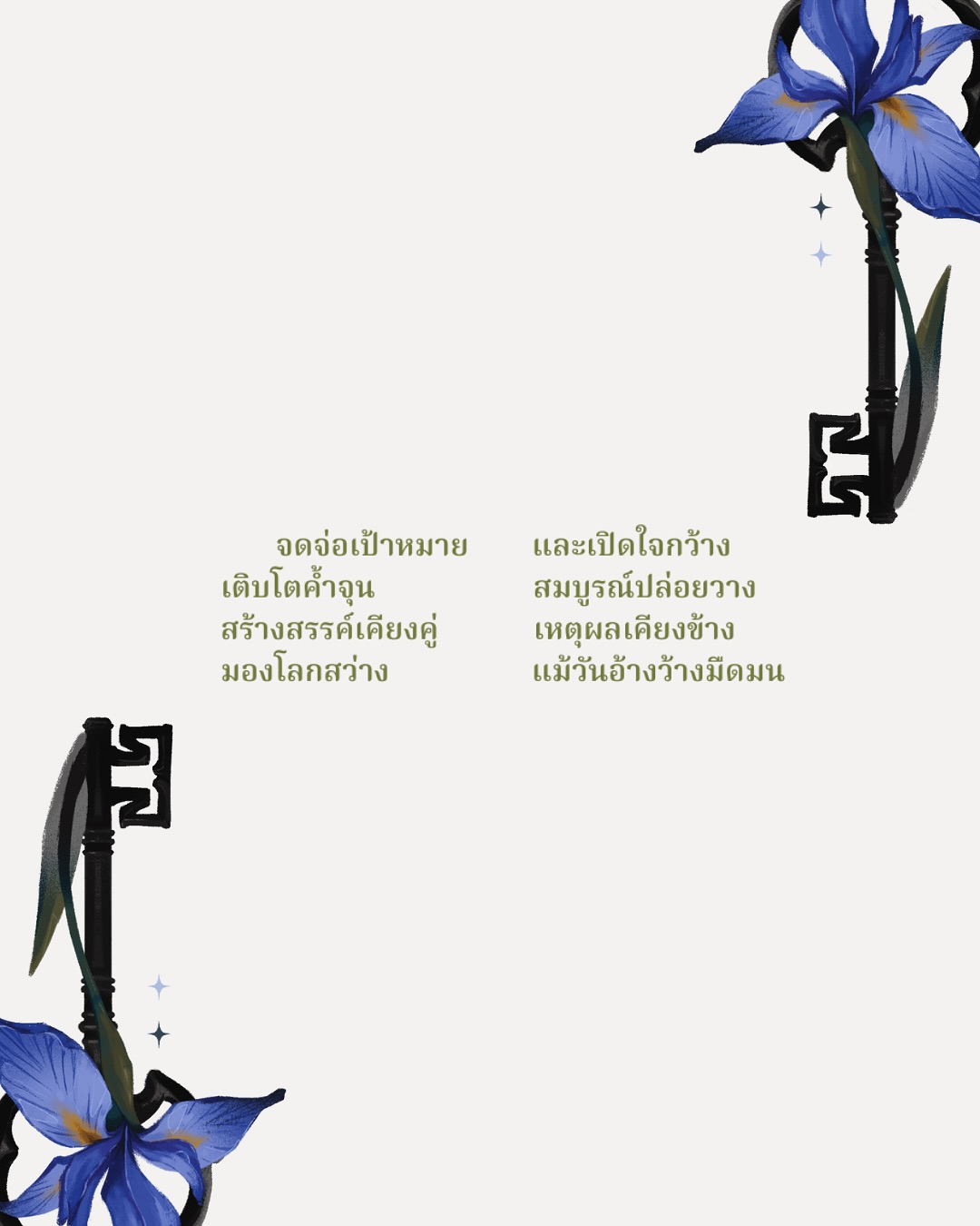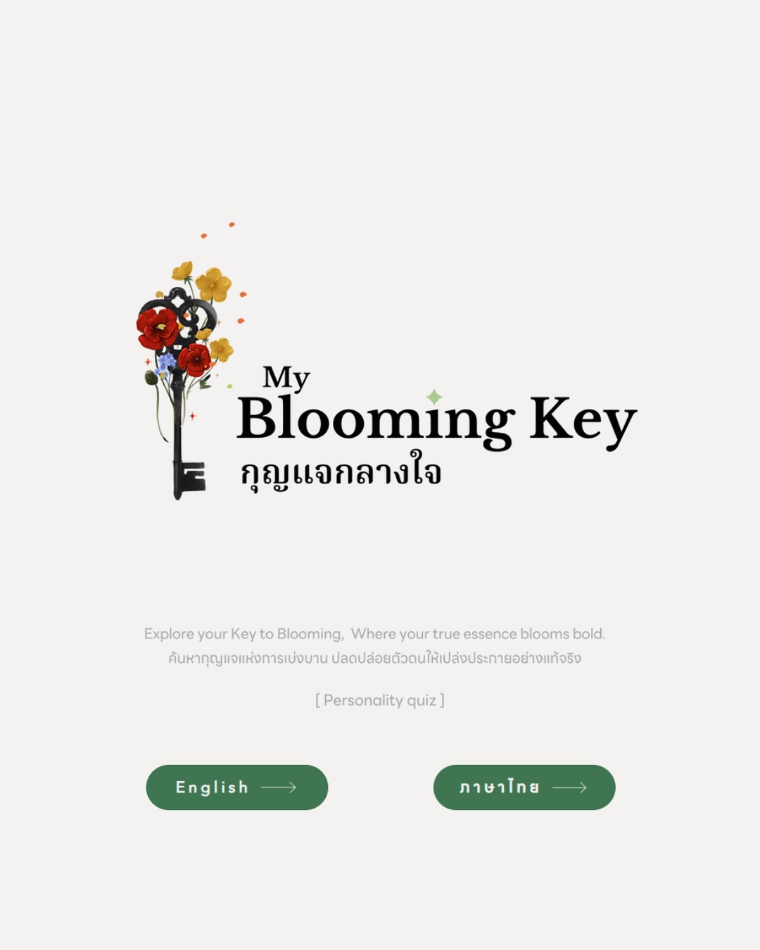 My Blooming Key : กุญแจกลางใจ คือแบบทดสอบเชิงจิตวิทยาสั้น ๆ ที่จะพาคุณเดินทางเข้าสู่สวนแห่งตัวตน สำรวจหัวใจผ่านคำถามที่ถูกออกแบบมาอย่างอ่อนโยน และในท้ายที่สุด… คุณจะพบกับ “ดอกไม้” ที่สะท้อนตัวคุณได้งดงามที่สุด