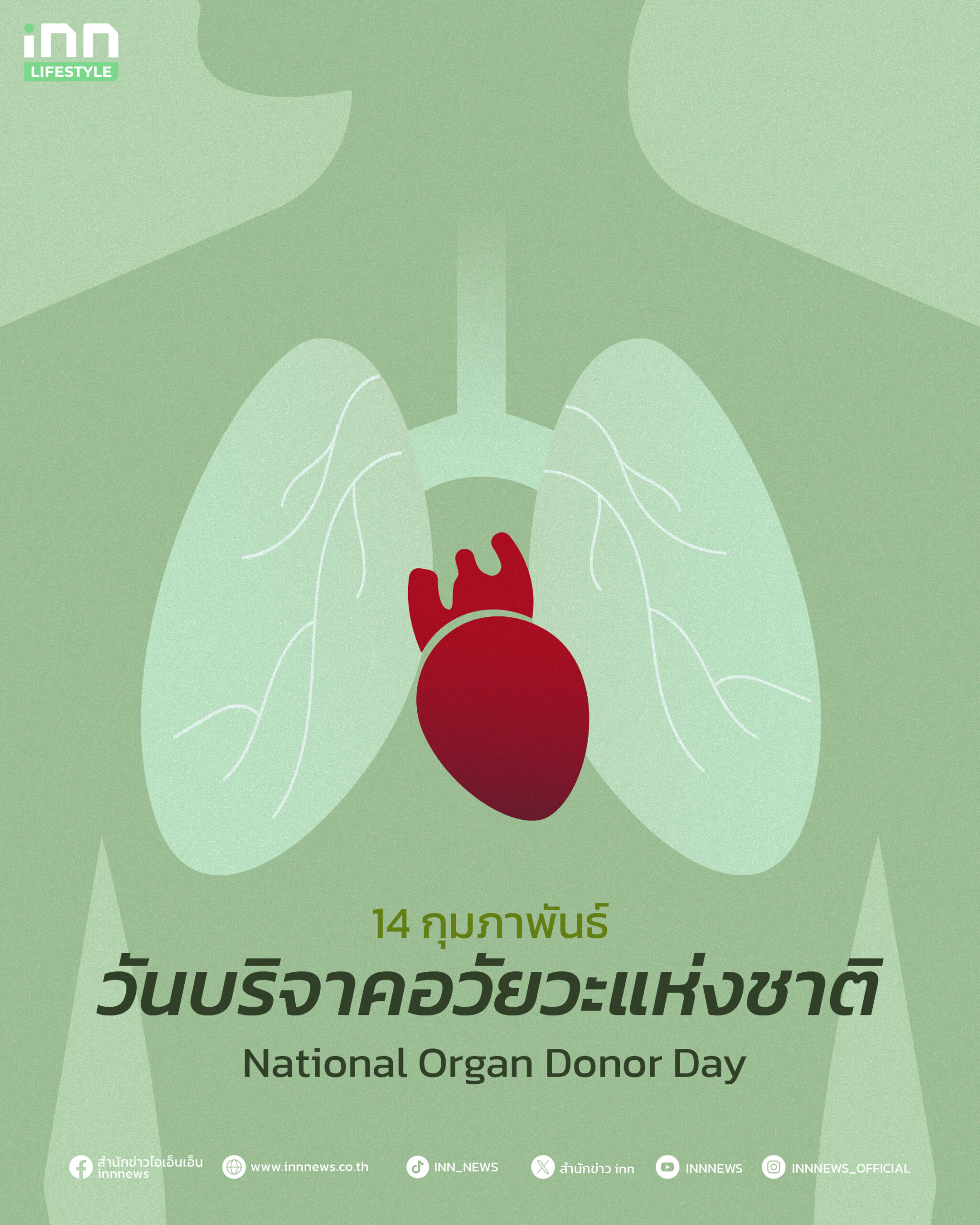 วันวาเลนไทน์ปีนี้ มาร่วมทำให้ความรักมีความหมายมากขึ้นด้วยการเป็นผู้ให้ใน “วันบริจาคอวัยวะแห่งชาติ” (National Organ Donor Day) นอกจากมอบความรักให้คนรอบข้างแล้ว สำนักข่าวไอ.เอ็น.เอ็น ขอเชิญชวนทุกท่านมาร่วมแบ่งปัน ช่วยต่อลมหายใจให้ผู้อื่น ถือเป็นการทำบุญครั้งสุดท้ายที่มีค่าที่สุด หลังจากที่เราหมดลมหายใจ