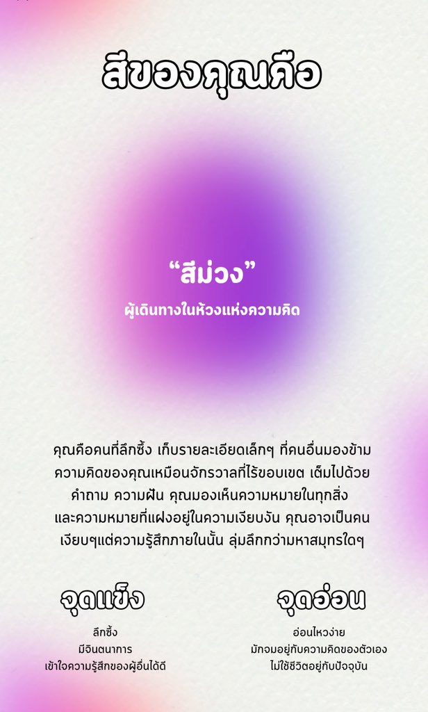 แล้วคุณล่ะ…เป็นสีอะไร? อย่าลืมแชร์ผลลัพธ์ให้เพื่อน ๆ และประกาศให้โลกรู้ว่า สีใดที่สะท้อนความเป็นตัวคุณมากที่สุด