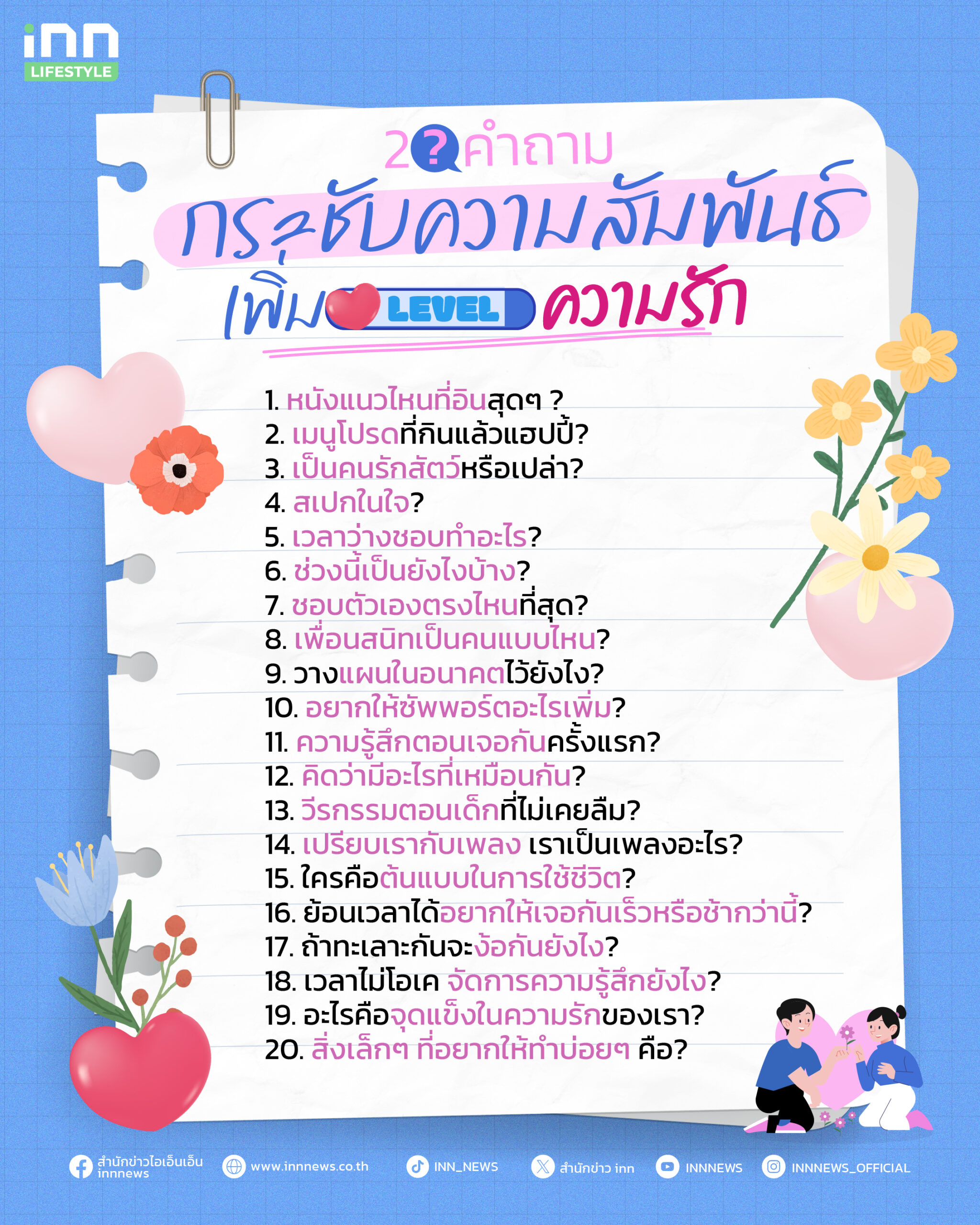 วันนี้เราจึงอยากชวนคุณมาเปิดบทสนทนาใหม่ ด้วย “20 คำถามกระชับความสัมพันธ์” ที่ไม่ได้มีไว้แค่ถามเล่นๆ แต่คือการเปิดประตูหัวใจ เพื่อเรียนรู้กันและกันในแง่มุมที่อาจยังไม่เคยเห็น