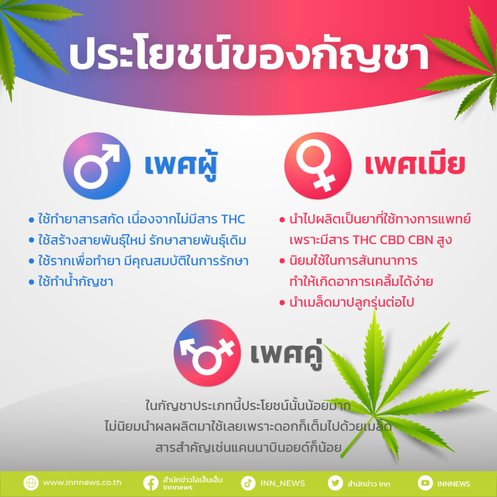 หลังจากอ่านจบกันไปแล้วจะเห็นได้ว่าเพศของกัญชานั้นมีผลมากว่าเราจะปลูกเพื่อไปใช้ทำอะไร รายละเอียดว่าปลูกอย่างไร จะต้องตัดแต่งแบบไหน จะต้องทำอย่างไรให้ได้เพศนี้ เราจะขอแยกไว้ครั้งต่อไป ติดตามเรื่องน่ารู้เกี่ยวกับกัญชาและกัญชงได้ที่ INN Lifestyle
