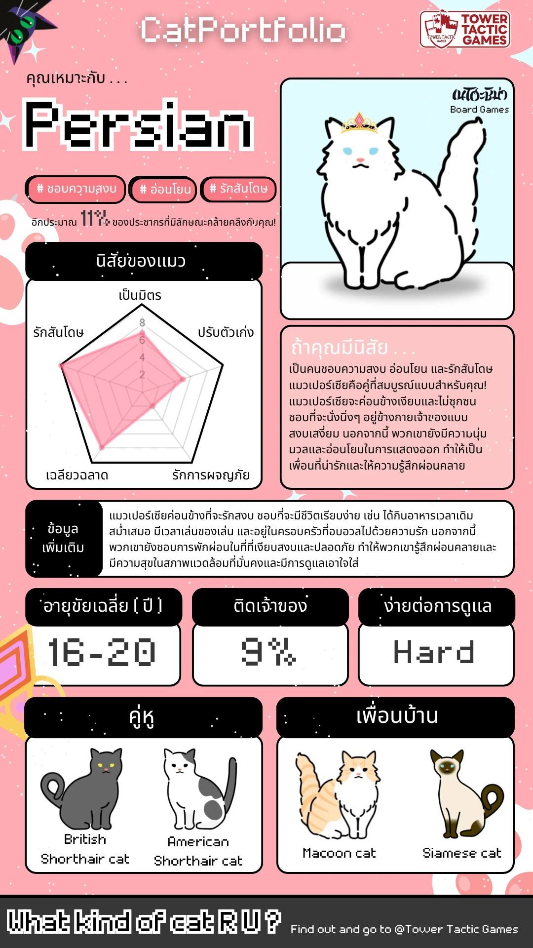 ซึ่งแบบทดสอบดังกล่าว Tower Tactic Games ได้ออกแบบแบบทดสอบบุคลิกภาพ ที่จะจับคู่คุณกับแมวพันธุ์ที่ใช่ที่สุดในรูปแบบ Cat Portfolio ✨