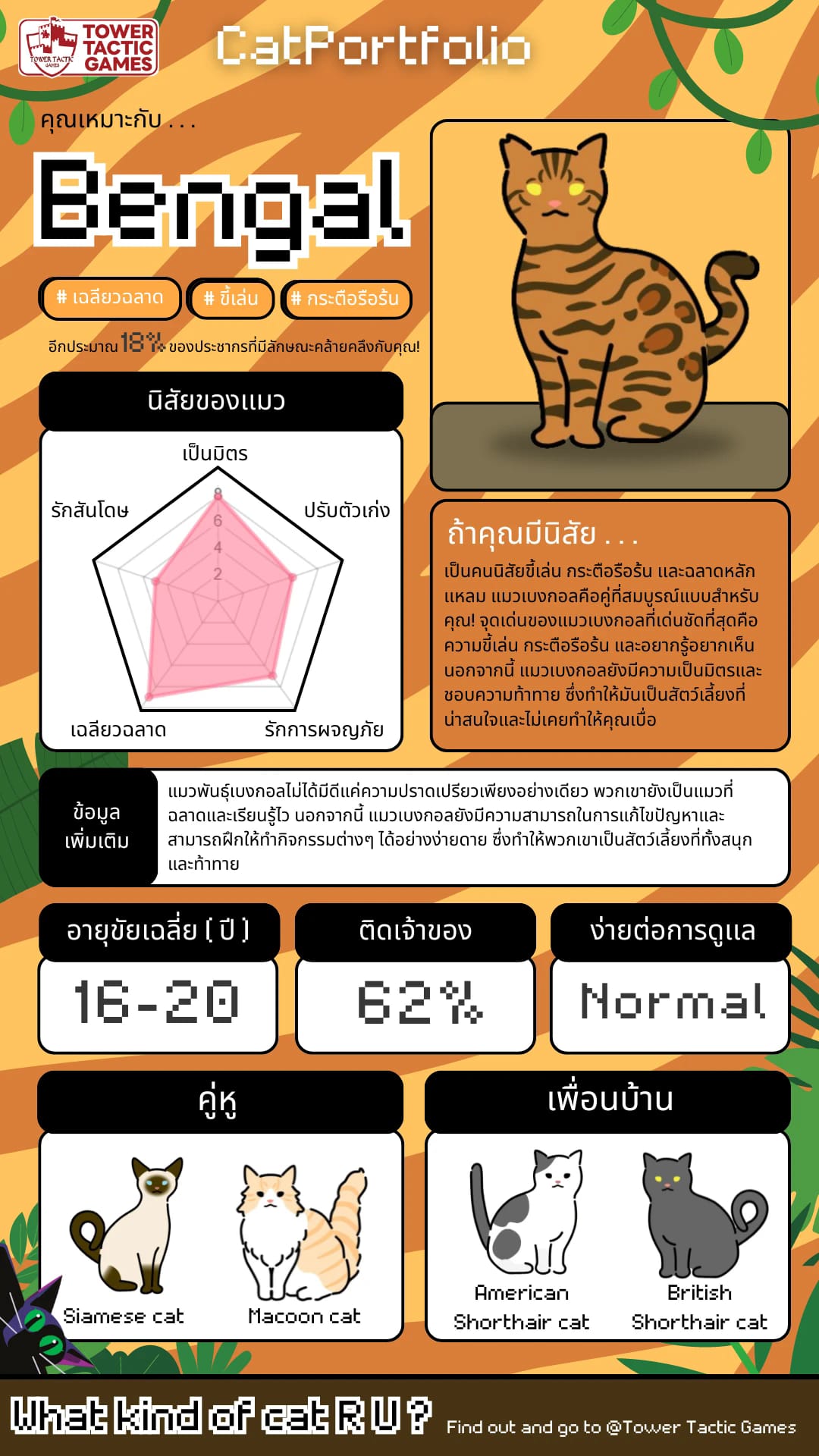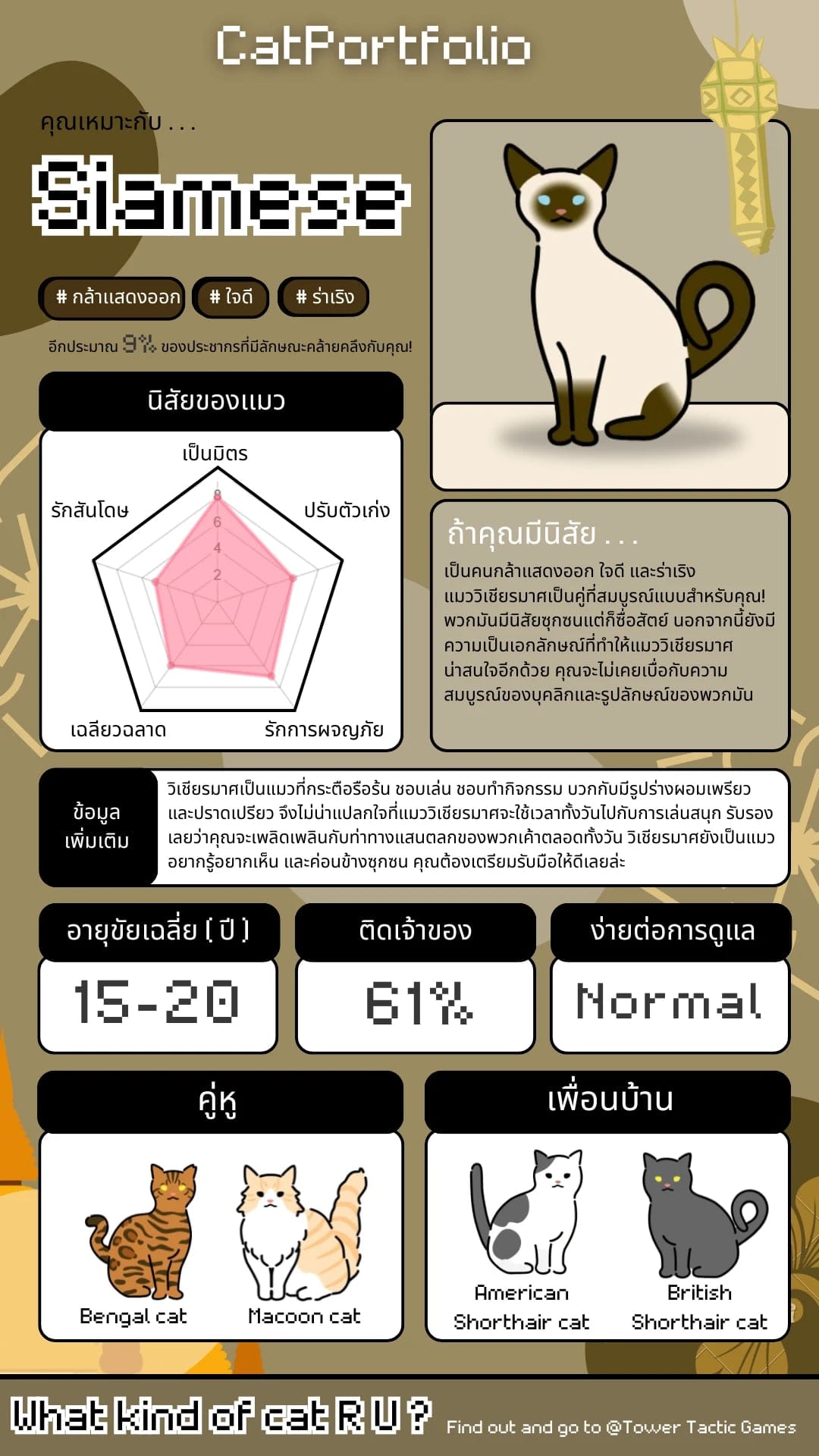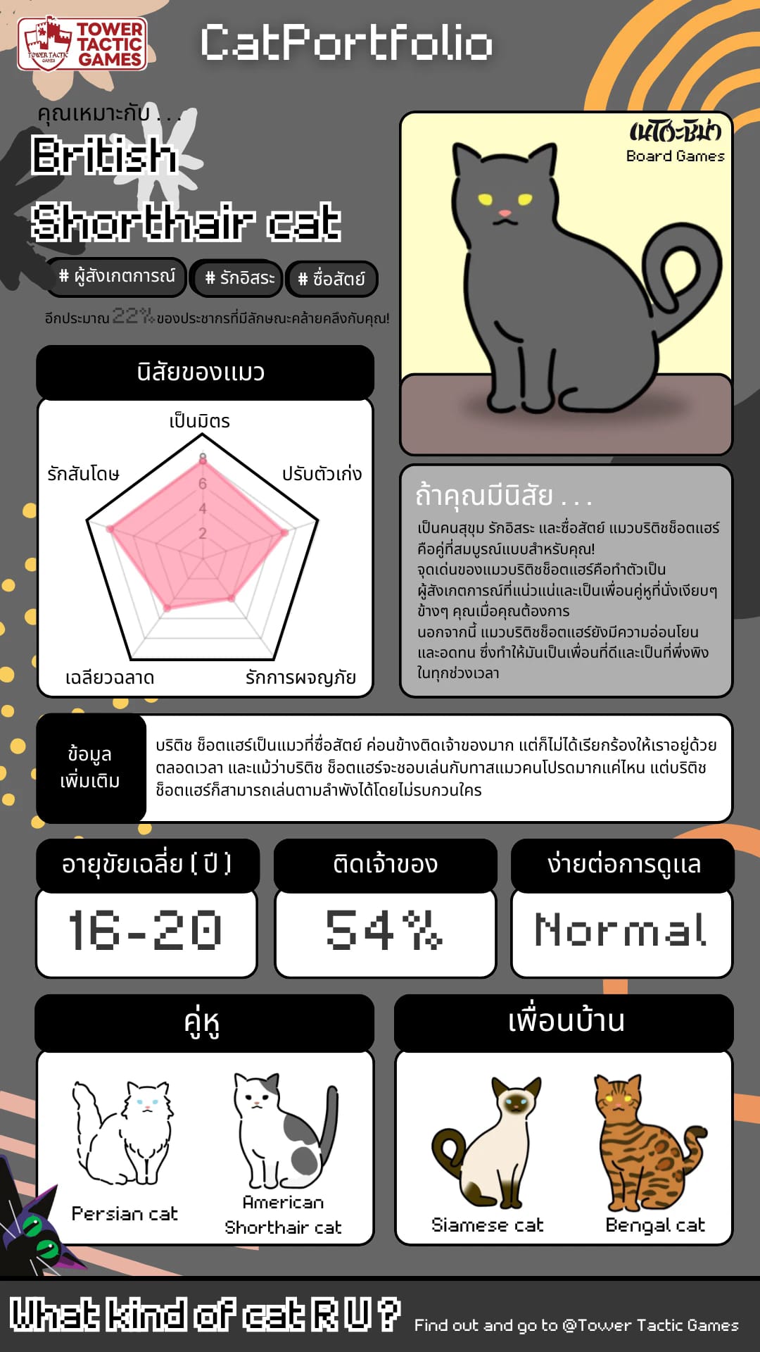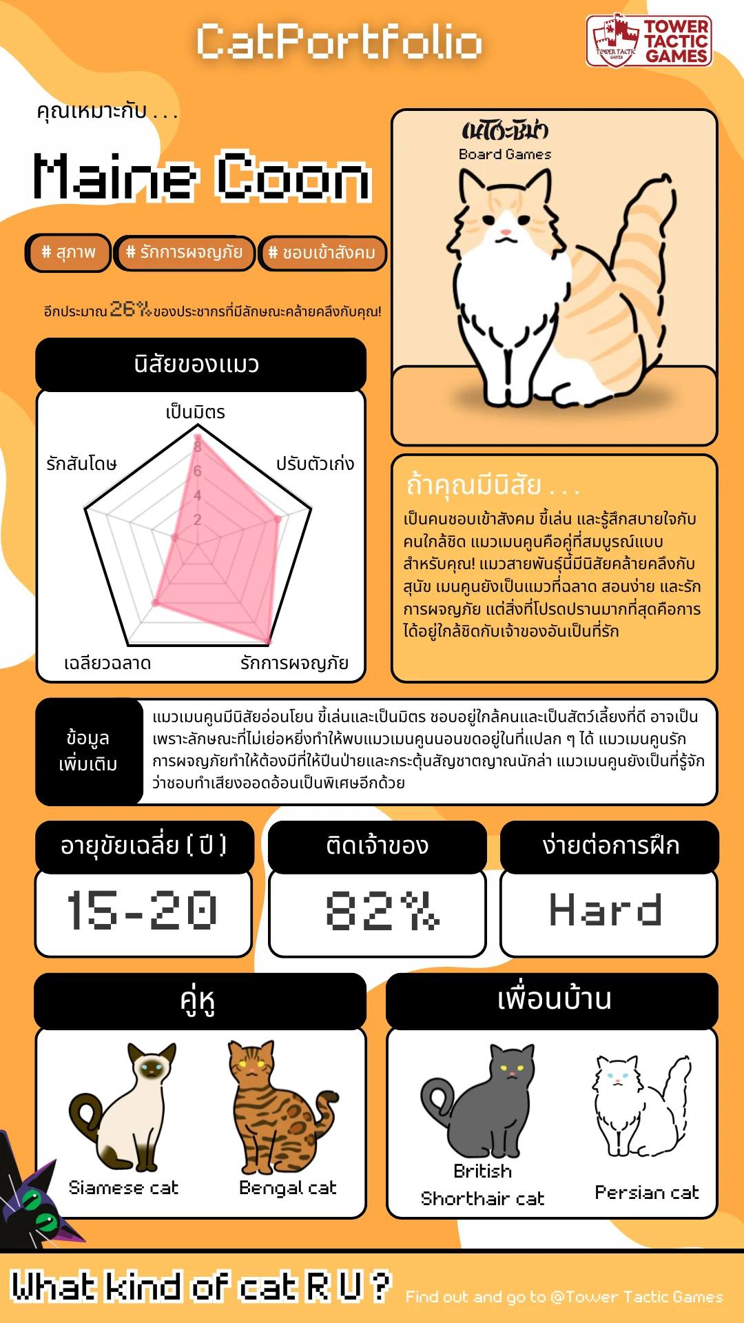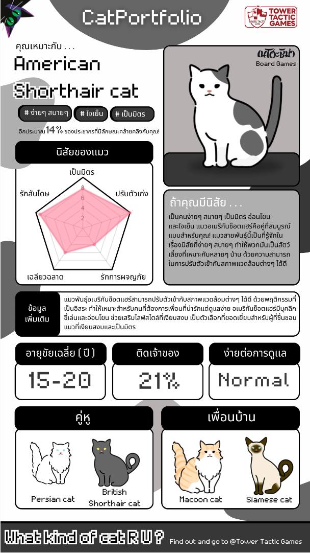 ซึ่งแบบทดสอบดังกล่าว Tower Tactic Games ได้ออกแบบแบบทดสอบบุคลิกภาพ ที่จะจับคู่คุณกับแมวพันธุ์ที่ใช่ที่สุดในรูปแบบ Cat Portfolio ✨