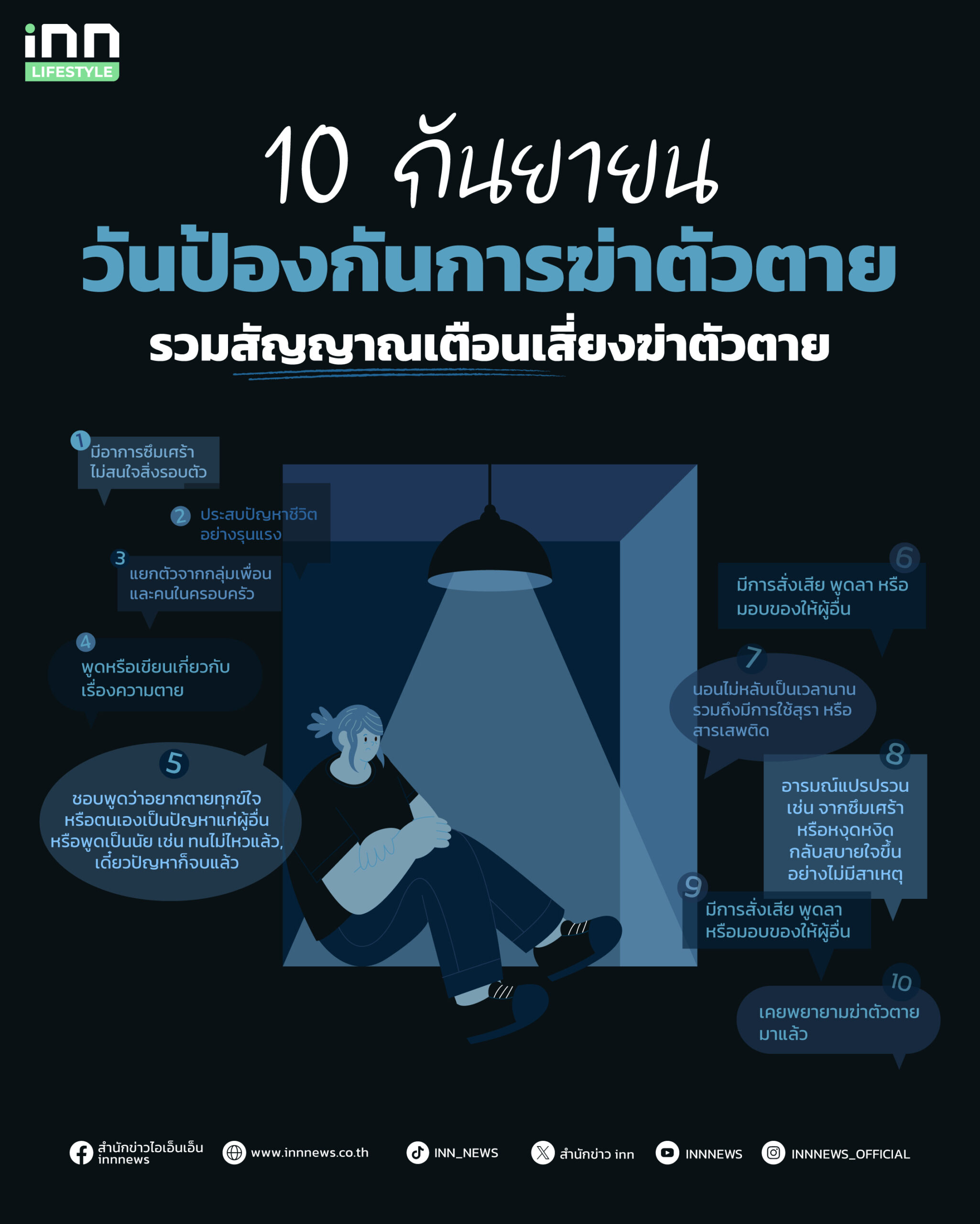 เนื่องในโอกาสวันที่ 10 กันยายน ซึ่งเป็นวันป้องกันการฆ่าตัวตายโลก INN จึงอยากจะพามาทำความเข้าใจปัญหานี้ให้มากขึ้น ไม่มองว่าเป็นเรื่องไกลตัวอีกต่อไป และทำให้คนที่กำลังเผชิญกับปัญหารู้ว่า “คุณไม่ได้อยู่คนเดียว”