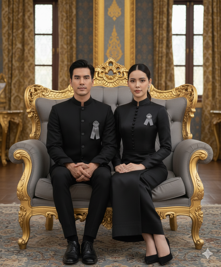 -สร้างรูปถ่ายบุคคล ใบหน้าเหมือนเดิมตามต้นฉบับ 100% ทรงผมดูเรียบร้อยเหมาะกับงานพิธีทางการ ใส่สูทแขนยาวสีดำแบบทางการ ปกคอจีน กระดุมติดเรียงยาวลงมาด้านหน้า ติดเข็มกลัดริบบิ้นสีเทา ใส่กางเกงสแลคขายาวสีดำ รองเท้าคัทชูหนังสีดำ โพสท่ายืนแบบมือประสานกันดูสุขุมเรียบร้อย หันตัวเอียงหากล้องเล็กน้อย หันหน้ามองกล้อง ใบหน้าปกติไม่ยิ้ม ฉากหลังเป็นวัดพระแก้ว