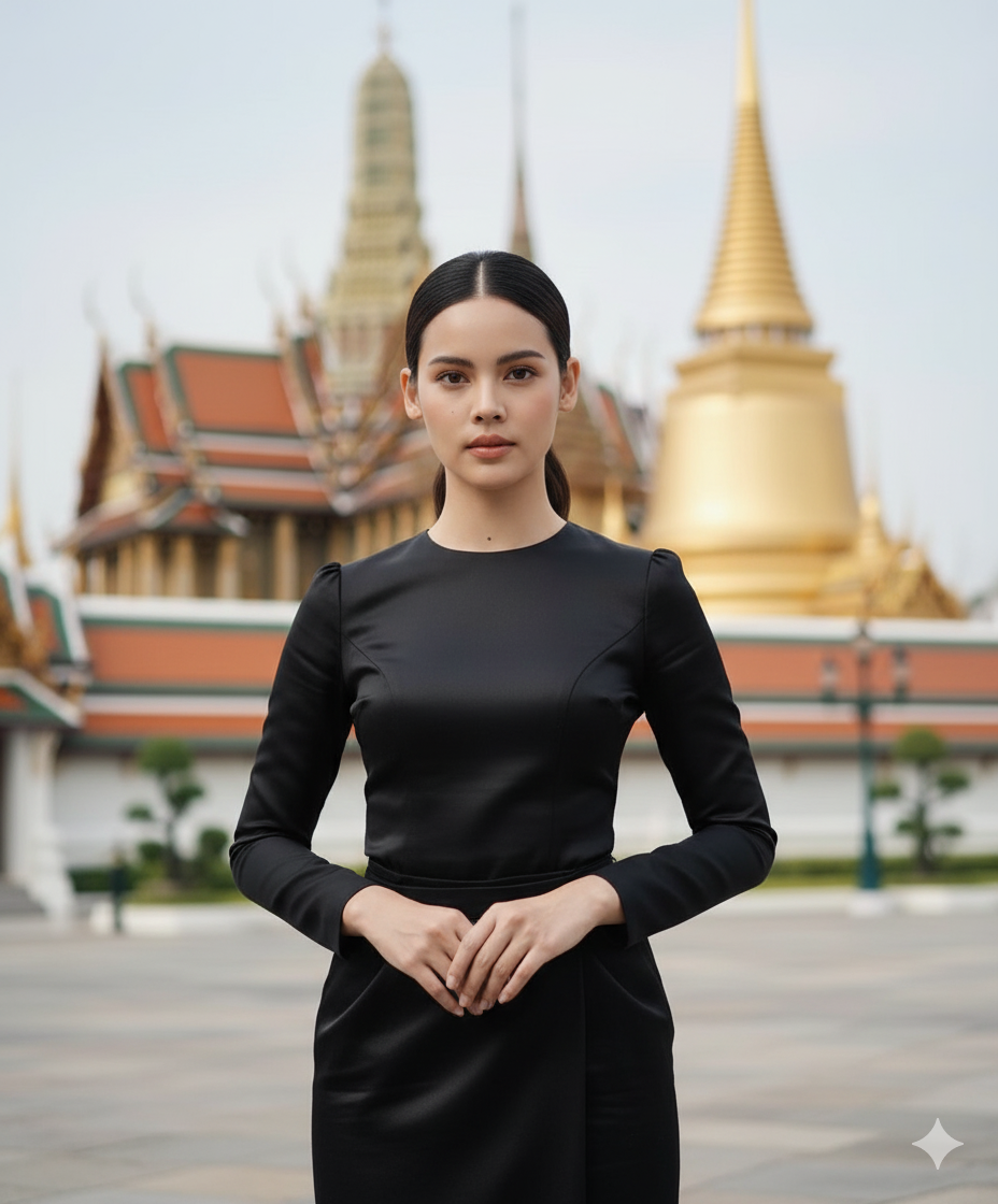 -สร้างรูปถ่ายบุคคล ใบหน้าเหมือนเดิมตามต้นฉบับ 100% แต่งหน้าให้ดูสวยเป็นธรรมชาติ เกล้าผมมวยต่ำดูสุภาพเรียบร้อย ใส่ชุดผ้าไหมไทยจิตรลดาสีดำ เสื้อคอจีน ติดเข็มกลัดริบบิ้นสีเทา ท่อนล่างเป็นผ้าถุงยาวสีดำ ใส่รองเท้าคัชชูส้นสูงสีดำ ใส่ต่างหูที่ดูเรียบร้อยเข้ากับชุด โพสท่ายืนแบบมือประสานกันดูสุขุมเรียบร้อย หันตัวเอียงหากล้องเล็กน้อย หันหน้ามองกล้อง ใบหน้าปกติไม่ยิ้ม ฉากหลังเป็นวัดพระแก้ว
