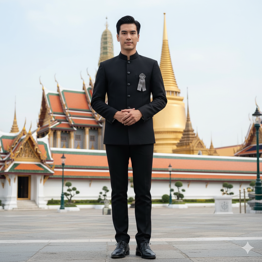 -ภาพถ่ายสมจริง, ห้ามเปลี่ยนใบหน้าของฉัน, ผู้ชายไทยสวมชุดพระราชทานสีดำทางการ (เสื้อแขนยาวสีดำ กางเกงสแลคสีดำ), ท่าทางสำรวม ยืนตรง มือตรงแนบลำตัว, สีหน้าสงบ, ทรงผมสั้นตัดเรียบร้อย, พื้นหลังเป็นพระบรมมหาราชวัง, แสงนุ่มนวล, Canon EOS R5, เลนส์ 85 มม. f/1.2, รูรับแสง f/1.2, DOF ตื้นพิเศษ, สไตล์ภาพ ไฮเปอร์เรียลิสติก