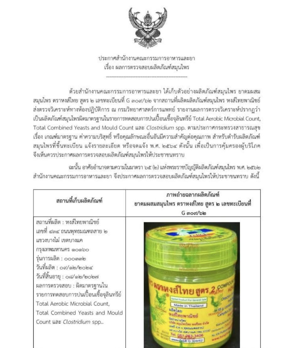 ยาดมหงส์ไทย สูตร 2 พบปนเปื้อนจุลินทรีย์