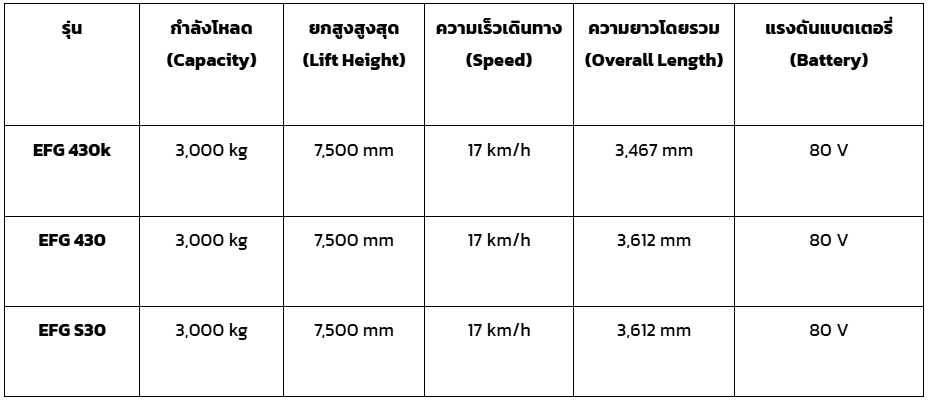 เปรียบเทียบโฟล์คลิฟท์ไฟฟ้า 3 ตัน รุ่น EFG 430, 430k และ S30 ต่างกันอย่างไร