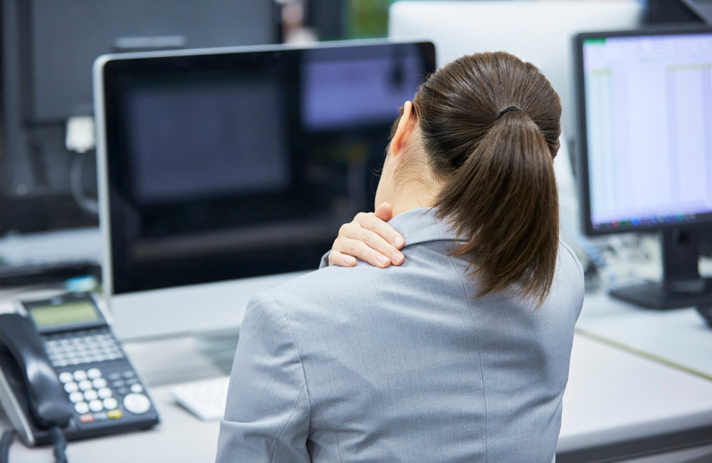 อาการคลาสสิกของคนออฟฟิศที่เกิดจากการเกร็งกล้ามเนื้อส่วนบนซ้ำ ๆ หรือการจ้องหน้าจอคอมพิวเตอร์ในระดับที่ไม่เหมาะสม ทำให้กล้ามเนื้อบ่าและสะบักต้องแบกรับน้ำหนักศีรษะที่โน้มไปข้างหน้า จนเกิดอาการตึง ปวด ร้าวและอาจลามไปถึงอาการปวดศีรษะแบบไมเกรนได้