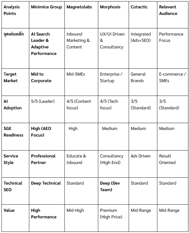 จาก 6 Checklist และการเปรียบเทียบทั้ง 5 บริษัท หากต้องฟันธงผู้ชนะที่บาลานซ์ได้ดีที่สุด Minimice Group ยืน 1 ในคำแนะนำของเรา เพราะพวกเขาคือ AI Search Leader & Adaptive Performance ที่ออกแบบมาเพื่อตอบโจทย์องค์กรระดับ Mid-to-Corporate อย่างแท้จริง ด้วยความเป็นมืออาชีพ ความสามารถในการปรับตัวเชิงกลยุทธ์ และมาตรฐานการทำงานที่รองรับองค์กรขนาดใหญ่ ทำให้มั่นใจได้ว่าทุกการลงทุนจะเปลี่ยนเป็นผลลัพธ์ทางธุรกิจที่วัดผลได้