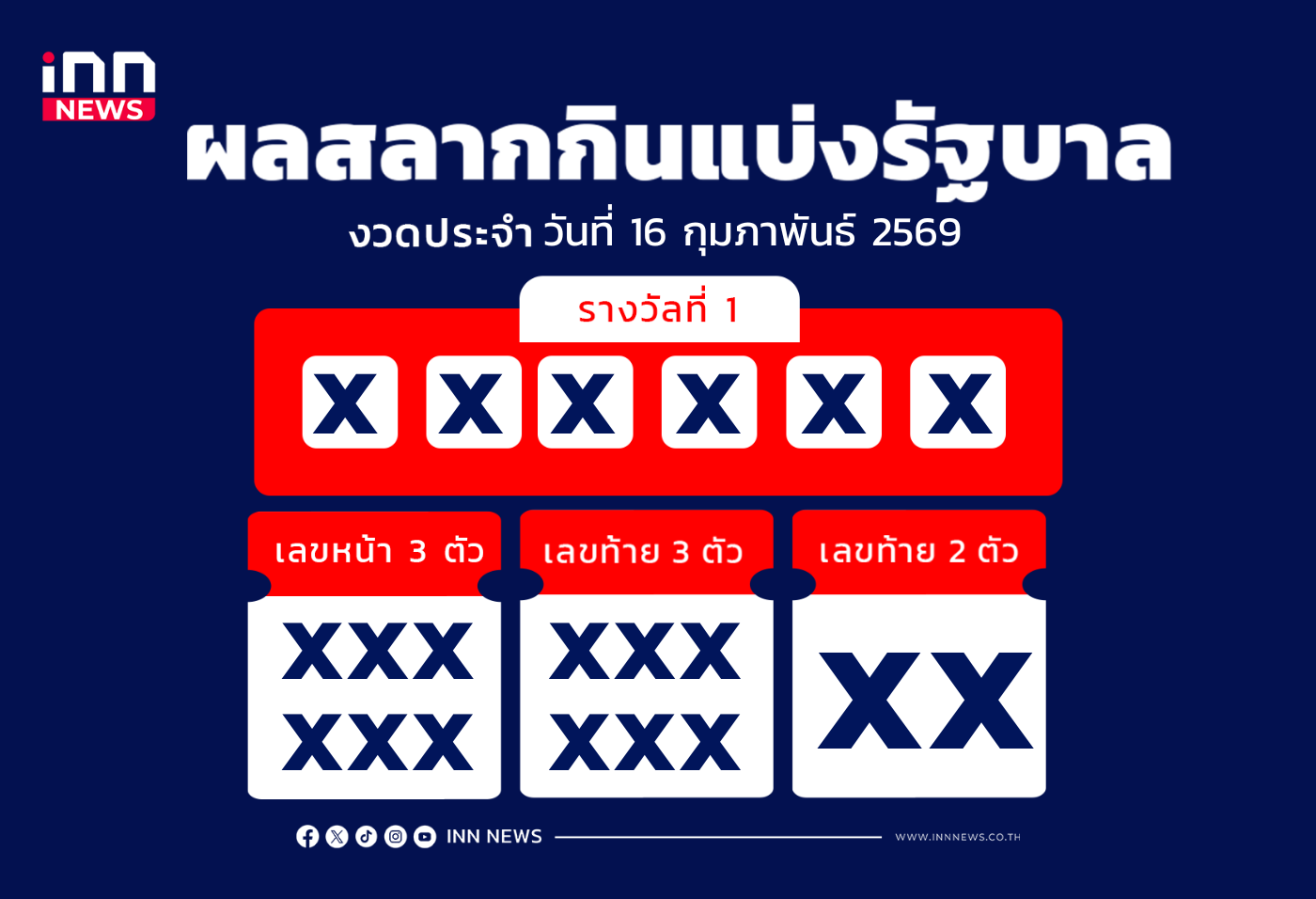 สามารถตรวจผลรางวัลงวดล่าสุดได้ที่ iNN Lottery