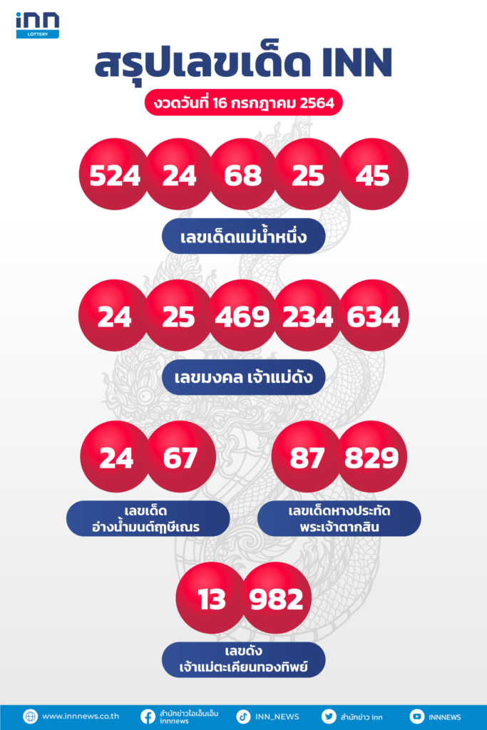 สรุปเลขเด็ด เลขมาแรง งวดวันที่ 16 กรกฎาคม 2564 กับ ไอ.เอ็น.เอ็น.