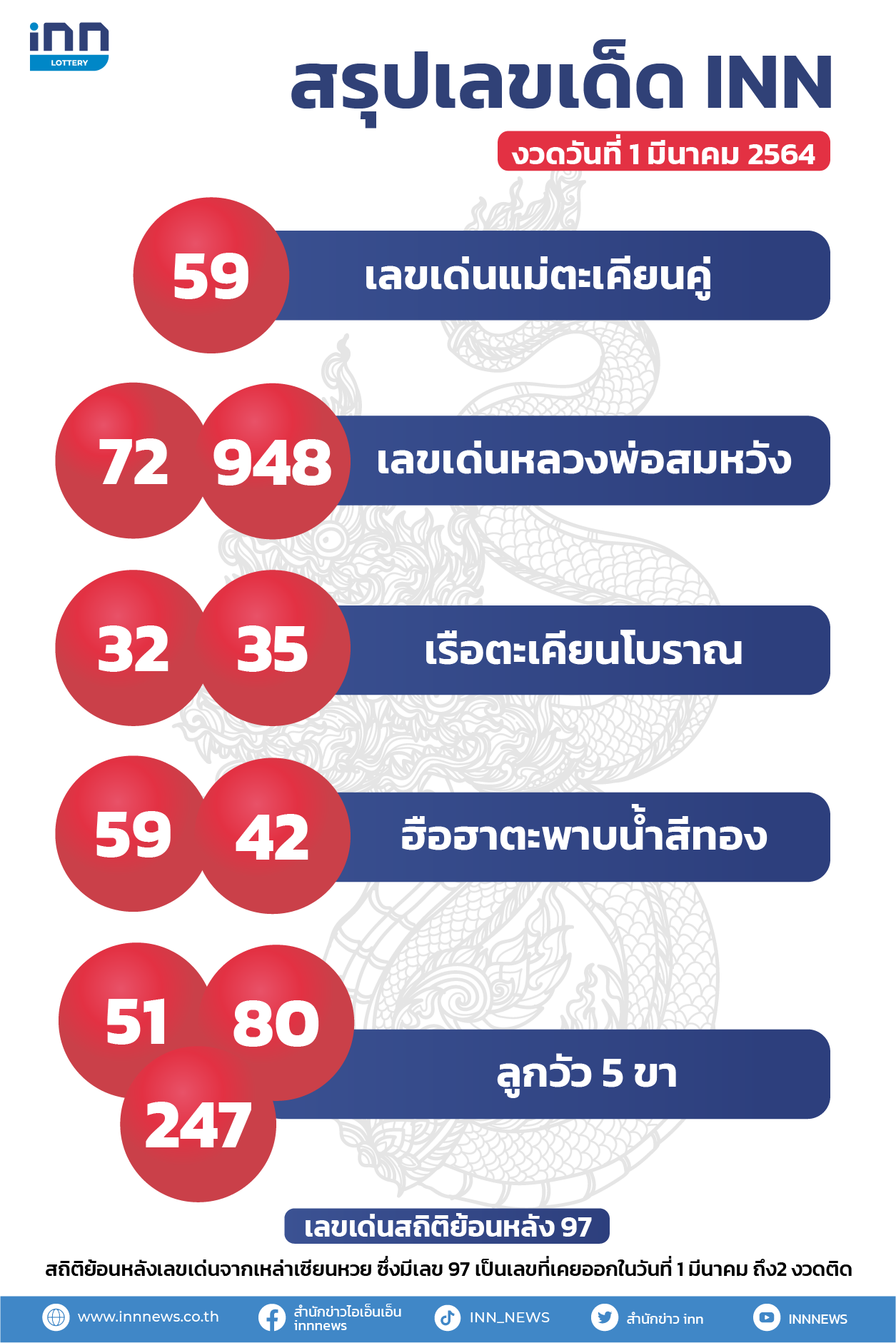 สรุปเลขเด็ด เลขมาแรง งวดวันที่ 1 มีนาคม 2564 กับ ไอ.เอ็น.เอ็น.