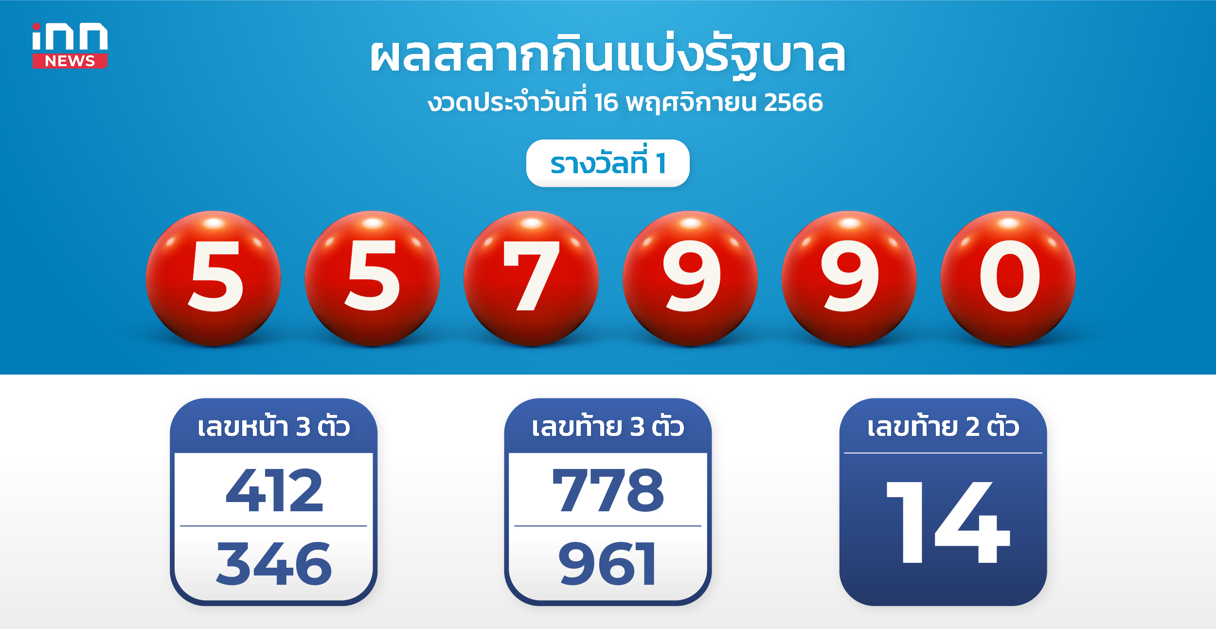 ผลสลากงวด 16 พ.ย. 66 รางวัลที่ 1 คือ 557990 สองตัว 14