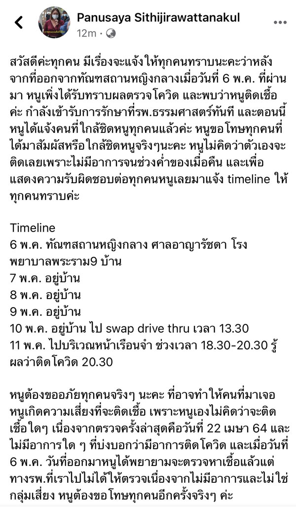 หนูต้องขออภัยทุกคนจริงๆ นะคะ ที่อาจทำให้คนที่มาเจอหนูเกิดความเสี่ยงที่จะติดเชื้อ เพราะหนูเองไม่คิดว่าจะติดเชื้อใดๆ เนื่องจากตรวจครั้งล่าสุดคือวันที่ 22 เมษา 64 และไม่มีอาการใด ๆ ที่บ่งบอกว่ามีอาการติดโควิด และเมื่อวันที่ 6 พ.ค. วันที่ออกมาหนูได้พยายามจะตรวจหาเชื้อแล้วแต่ทางรพ.ที่เราไปไม่ได้ให้ตรวจเนื่องจากไม่มีอาการและไม่ใช่กลุ่มเสี่ยง หนูต้องขอโทษทุกคนอีกครั้งจริงๆ ค่ะ
