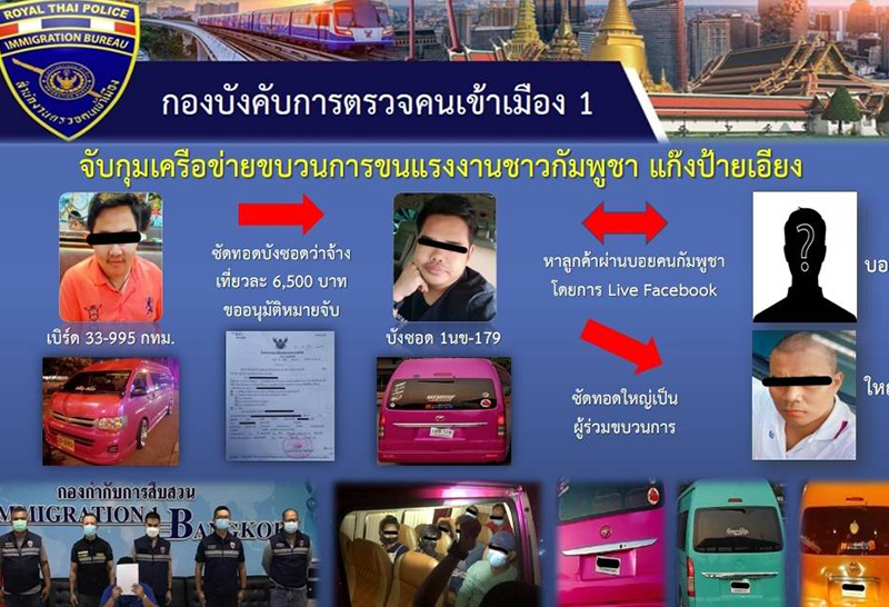 พล.ต.ท.สมพงษ์ ชิงดวง ผู้บัญชาการสำนักงานตรวจคนเข้าเมือง แถลงผลการจับกุม 3 คดีด้วยกัน คดีแรก ตำรวจ ตม.1 จับกุมขบวนการขนแรงงานชาวกัมพูชาผิดกฎหมาย โดยสามารถจับกุมผู้ต้องหาได้ 7 คน เป็นคนไทย 2 คน และชาวกัมพูชา 5 คน ได้บริเวณถนนรามคำแหง ขาออก ตรงข้ามซอยรามคำแหง 110 จากการสอบสวนทราบว่า กลุ่มนี้จะใช้รถตู้สีสันฉูดฉาด เช่น สีชมพู สีส้ม สีเขียว และติดแผ่นป้ายทะเบียนลักษณะเอียง 45 องศา เพื่อเป็นสัญลักษณ์ของกลุ่ม ตระเวนรับชาวกัมพูชา ในเขตกรุงเทพมหานครและปริมณฑล ในราคาครั้งละ 6,500 บาทต่อเที่ยว เพื่อพากลุ่มชาว ต่างด้าว หลบหนีออกไปยังประเทศกัมพูชา ผ่านทางช่องทางธรรมชาติ โดยจะมี นายบอย ชาวกัมพูชา ที่ยังหลบหนี เป็นนายหน้าคอยหาลูกค้าผ่านเฟซบุ๊ก ในลักษณะการไลฟ์สดชักชวนให้แรงงานชาวกัมพูชาที่มีความประสงค์จะเดินทางกลับประเทศให้มาใช้บริการ อย่างไม่เกรงกลัวกฎหมาย โดยมี นายใหญ่ ชาวไทย เป็นอีกหนึ่งผู้ร่วมขบวนการ ซึ่งตำรวจจะสืบสวนขยายผลเพื่อติดตามตัวต่อไป