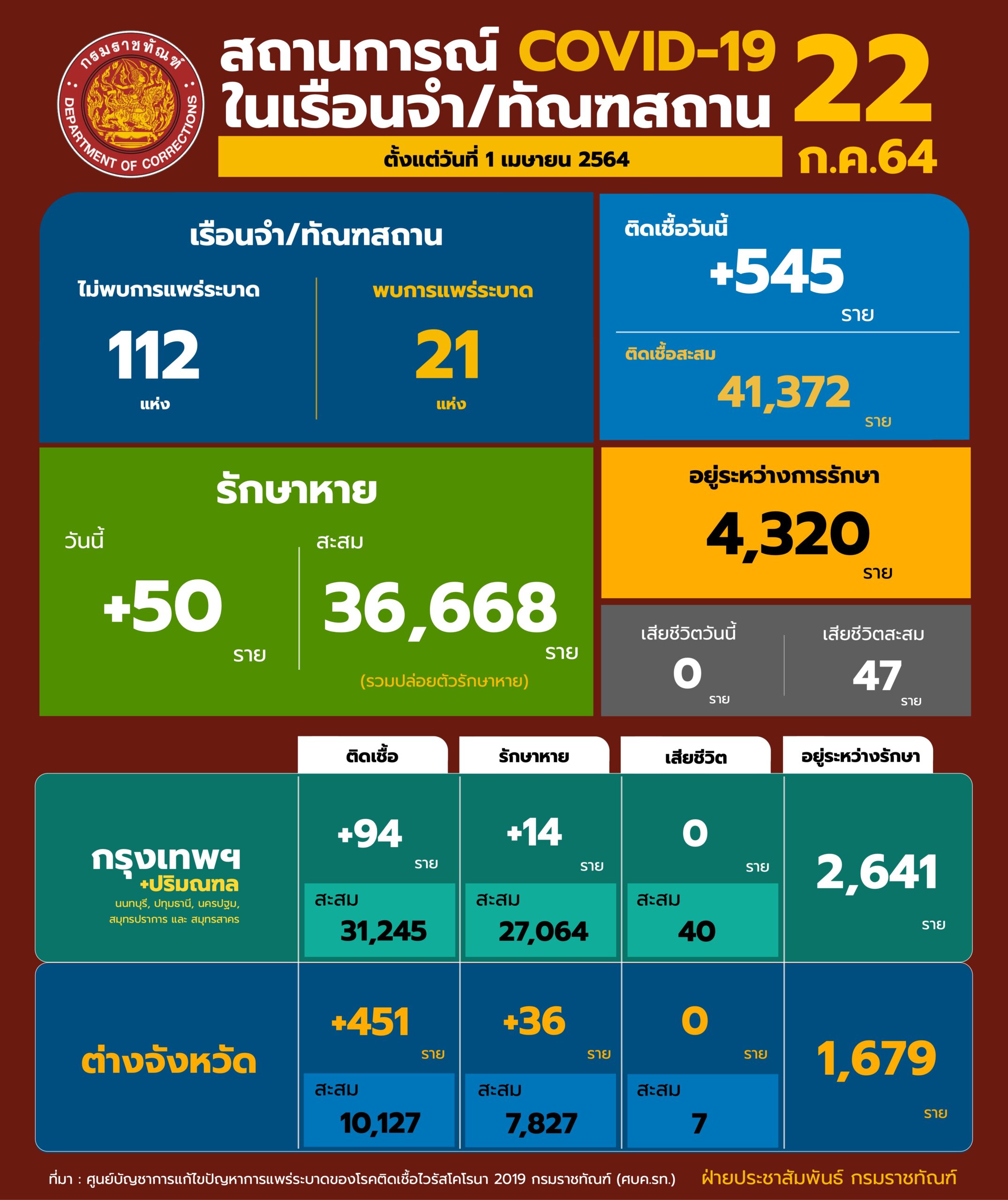 วันที่ 22 ก.ค. 2564 นายอายุตม์ สินธพพันธุ์ อธิบดีกรมราชทัณฑ์ เปิดเผยถึงสถานการณ์การแพร่ระบาดของโรคติดเชื้อไวรัสโควิด-19 ในเรือนจำและทัณฑสถาน (ข้อมูล ณ วันที่ 21 กรกฎาคม 2564 เวลา 16.00 นาฬิกา) พบผู้ติดเชื้อรายใหม่ 545 ราย (พบในเรือนจำสีแดง 455 ราย และพบในห้องแยกกักโรคผู้ต้องขังรับใหม่ 90 ราย) หายป่วยเพิ่ม 50 ราย รวมยังมีผู้ต้องขังติดเชื้อที่อยู่ในการดูแลของกรมราชทัณฑ์ 4,320 ราย และไม่มีรายงานผู้เสียชีวิตต่อเนื่องเป็นวันที่ 12