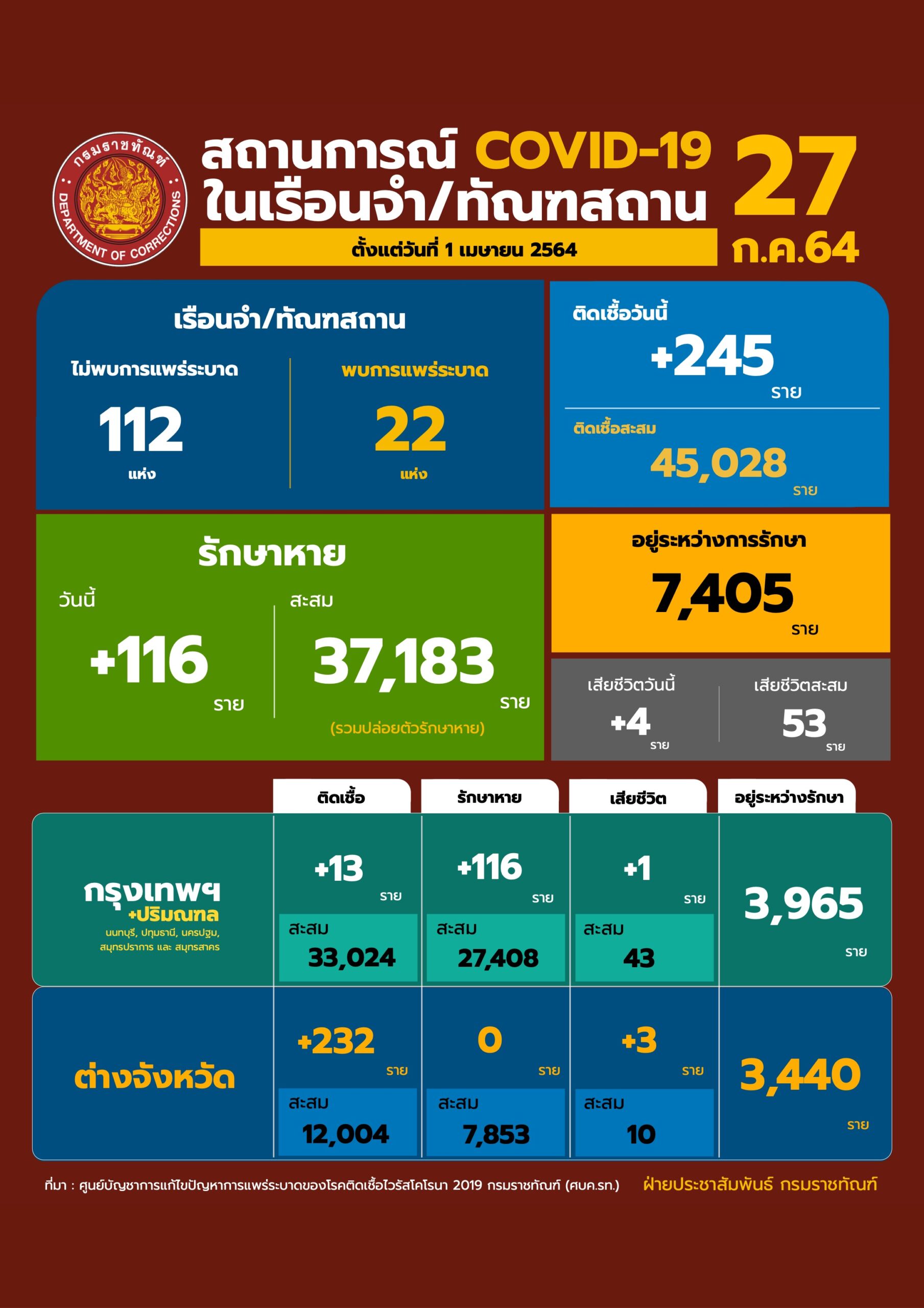 (ข้อมูล ณ วันที่ 26 กรกฎาคม 2564 เวลา 16.00 น.) พบผู้ติดเชื้อรายใหม่ 245 ราย พบในเรือนจำสีแดง 243 ราย และพบในห้องแยก