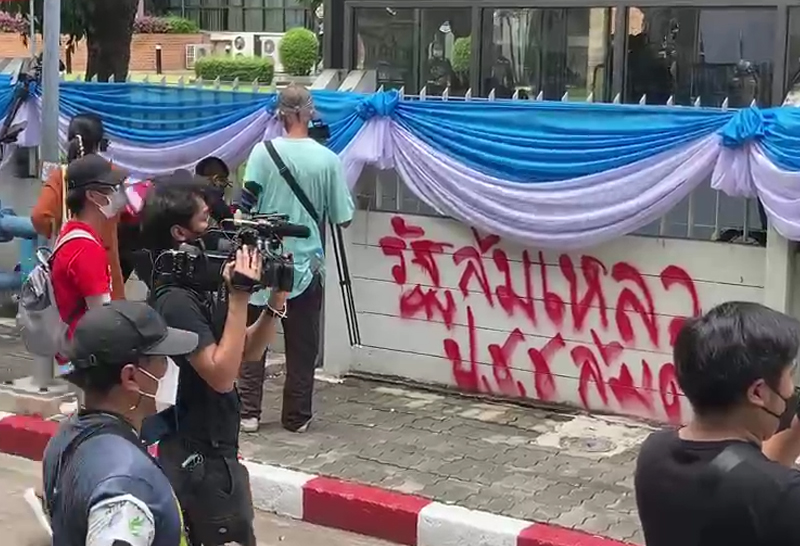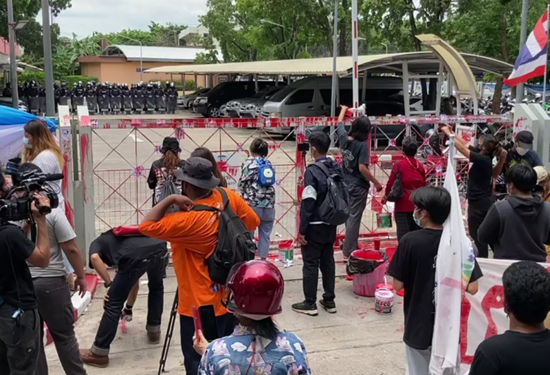 โดยกลุ่มมวลชนทั้งชาย และหญิงเรียกร้อง พร้อมนำสีน้ำ และสีสเปรย์ฉีดพ่นใส่ตามรั้ว กำแพง และพื้นผิวถนน และทางตำรวจได้รับความเสียหาย จากสีสเปรย์ เปรอะเปื้อนชุดเครื่องแบบ ต่อมา ตำรวจควบคุมฝูงชน พร้อมชุดปราบจลาจล มีอาวุธเป็นโล่ กระบอง เข้ากระชับพื้นที่ เข้าควบคุมตัว นายจตุภัทร์ พร้อมมวลชน จำนวนหลายคน ขึ้นรถผู้ต้องขังที่มาจอดรอรับ พร้อมทั้งกันสื่อมวลชนและผู้ไม่เกี่ยวข้องออกนอกพื้นที่