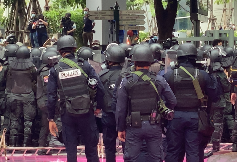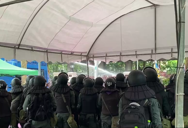 เมื่อเวลา 16:12 น. กลุ่มมวลชนได้เดินทางถึงหน้าสำนักงานตำรวจแห่งชาติและจัดกิจกรรม โดยการชูภาพความรุนแรงที่ได้เตรียมมา ขณะที่ด้านหน้าสำนักงานตำรวจแห่งชาติ เจ้าหน้าที่ได้นำรั้วลวดหนามล้อมด้านหลังประตู มีเจ้าหน้าที่ตำรวจควบคุมฝูงชน และรถน้ำอยู่ภายใน สํานักงานตํารวจแห่งชาติ ส่วนด้านนอก เจ้าหน้าที่นำผ้าใบพลาสติกมาปิดทับป้ายชื่อสำนักงานตำรวจ และล้อมด้วยรั้วเหล็ก ซึ่งในเวลาต่อมา ม็อบ ได้ใช้ถุงสีที่ได้เตรียมมา ขว้างปาไปยังป้ายสำนักงานตำรวจแห่งชาติ และปาเข้าไปด้านในสำนักงานตำรวจแห่งชาติ ขณะที่เจ้าหน้าที่ตำรวจได้มีการฉีดน้ำออกมาใส่กลุ่มผู้ชุมนุม