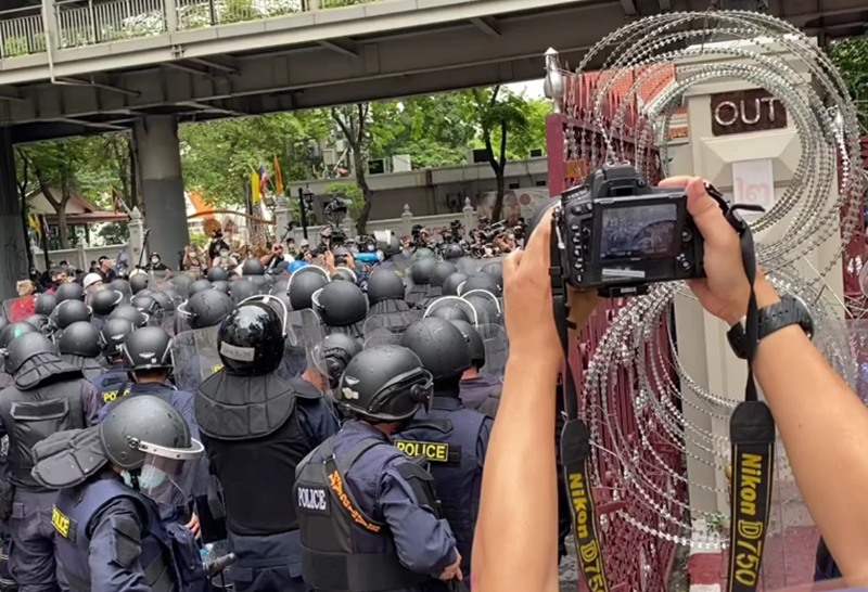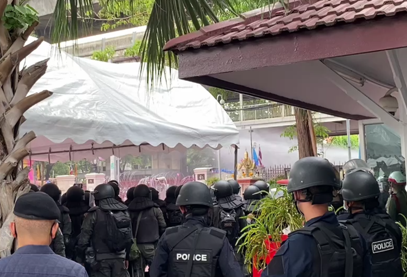 ม็อบ ชูภาพความรุนแรงหน้าสำนักงานตำรวจ ขณะเจ้าหน้าที่นำรั้วลวดหนามล้อมประตู ภายหลังมวลชน ได้ประกาศยุติการชุมนุม ในเพจทะลุฟ้า