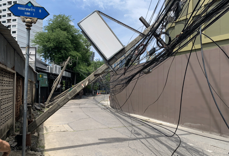 ตึกเก่ากำลังรื้อถอน ลาดพร้าวซอย 8 ผนังอาคารถล่ม ทับเสาไฟฟ้าล้มขวางถนน
