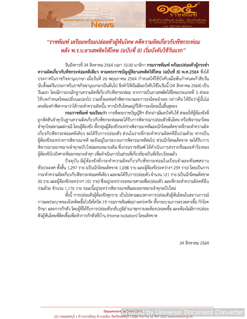 วันอังคารที่ 24 สิงหาคม 2564 กรมราชทัณฑ์ พร้อมปล่อยตัวผู้กระทำความผิดเกี่ยวกับพืชกระท่อมคดีเดียว ตามพระราชบัญญัติยาเสพติดให้โทษ (ฉบับที่ 8) พ.ศ.2564 ซึ่งได้ประกาศในราชกิจจานุเบกษา เมื่อวันที่ 26 พฤษภาคม 2564 กำหนดให้ใช้บังคับเมื่อพ้นกำหนดเก้าสิบวัน นับตั้งแต่วันประกาศในราชกิจจานุเบกษาเป็นต้นไป จึงทำให้เริ่มมีผลบังคับใช้ในวันนี้ (24 สิงหาคม 2564) เป็นวันแรก โดยมีการยกเลิกฐานความผิดที่เกี่ยวกับพืชกระท่อม จากการเป็นยาเสพติดให้โทษประเภทที่ 5 ส่งผลให้บทกำหนดโทษเปลี่ยนแปลงไป รวมทั้งผลต่อคำพิพากษาและการลงโทษจำเลย กล่าวคือ ให้ถือว่าผู้นั้นไม่เคยต้องคำพิพากษาว่าได้กระทำความผิดนั้น หากยังรับโทษอยู่ก็ให้การลงโทษนั้นสิ้นสุดลง